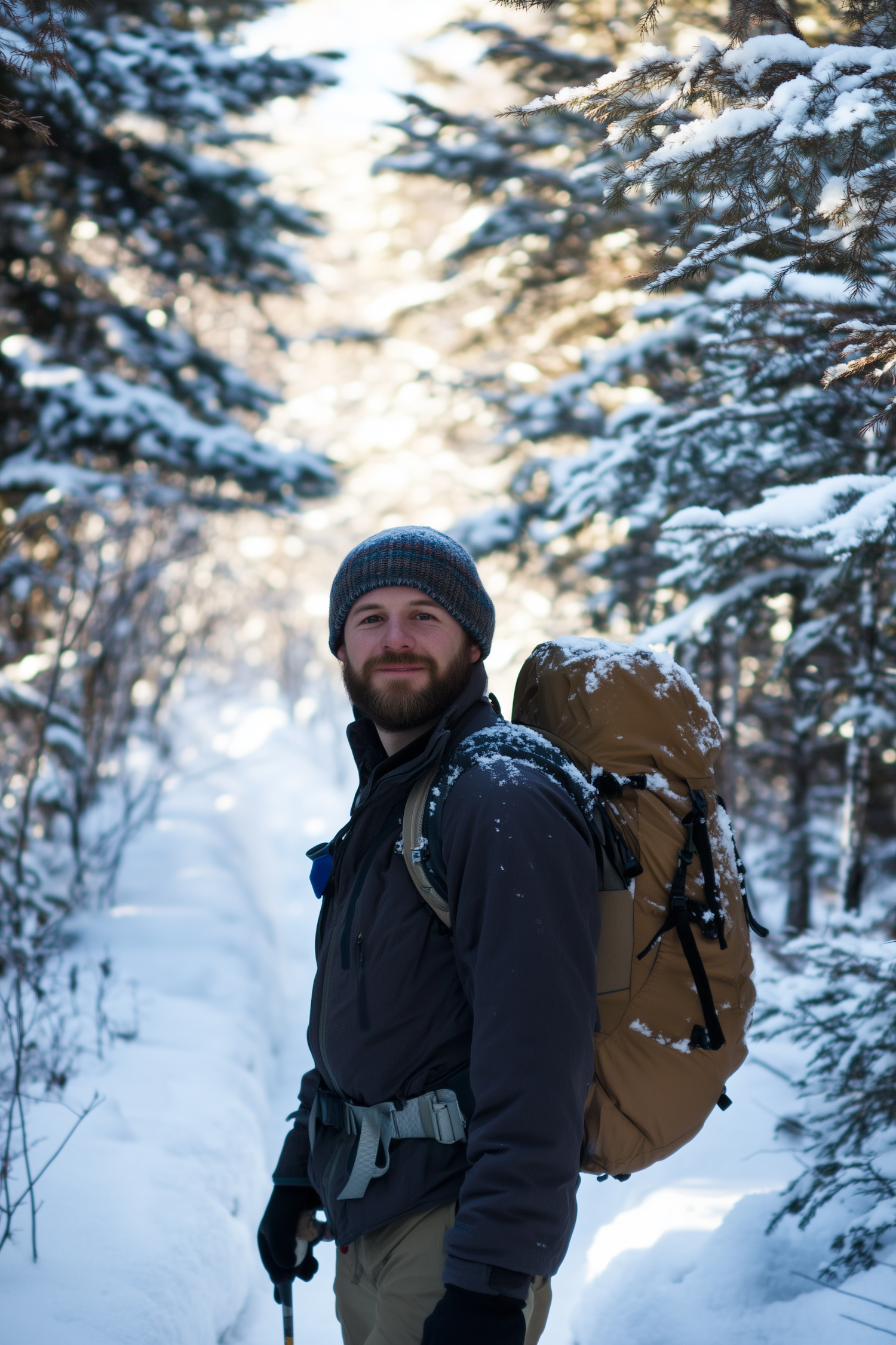 Bearded man hiking through a snowy forest trail, wearing a dark jacket, beanie, and tan backpack, surrounded by snow-covered trees.