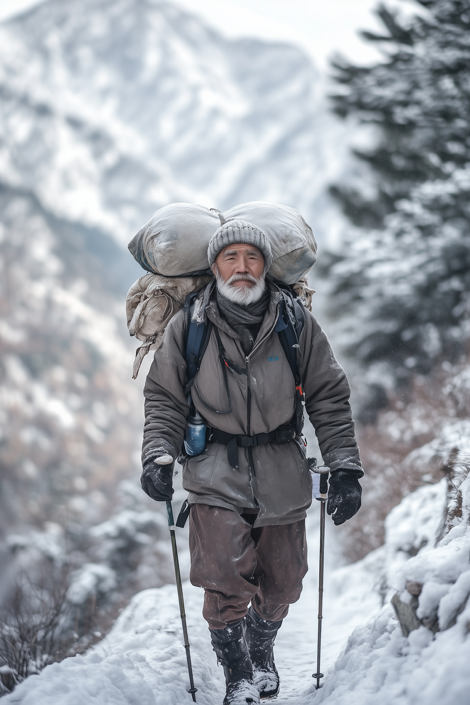 Elderly man trekking through snowy mountains with a large backpack and trekking poles, wearing winter gear and a determined expression.