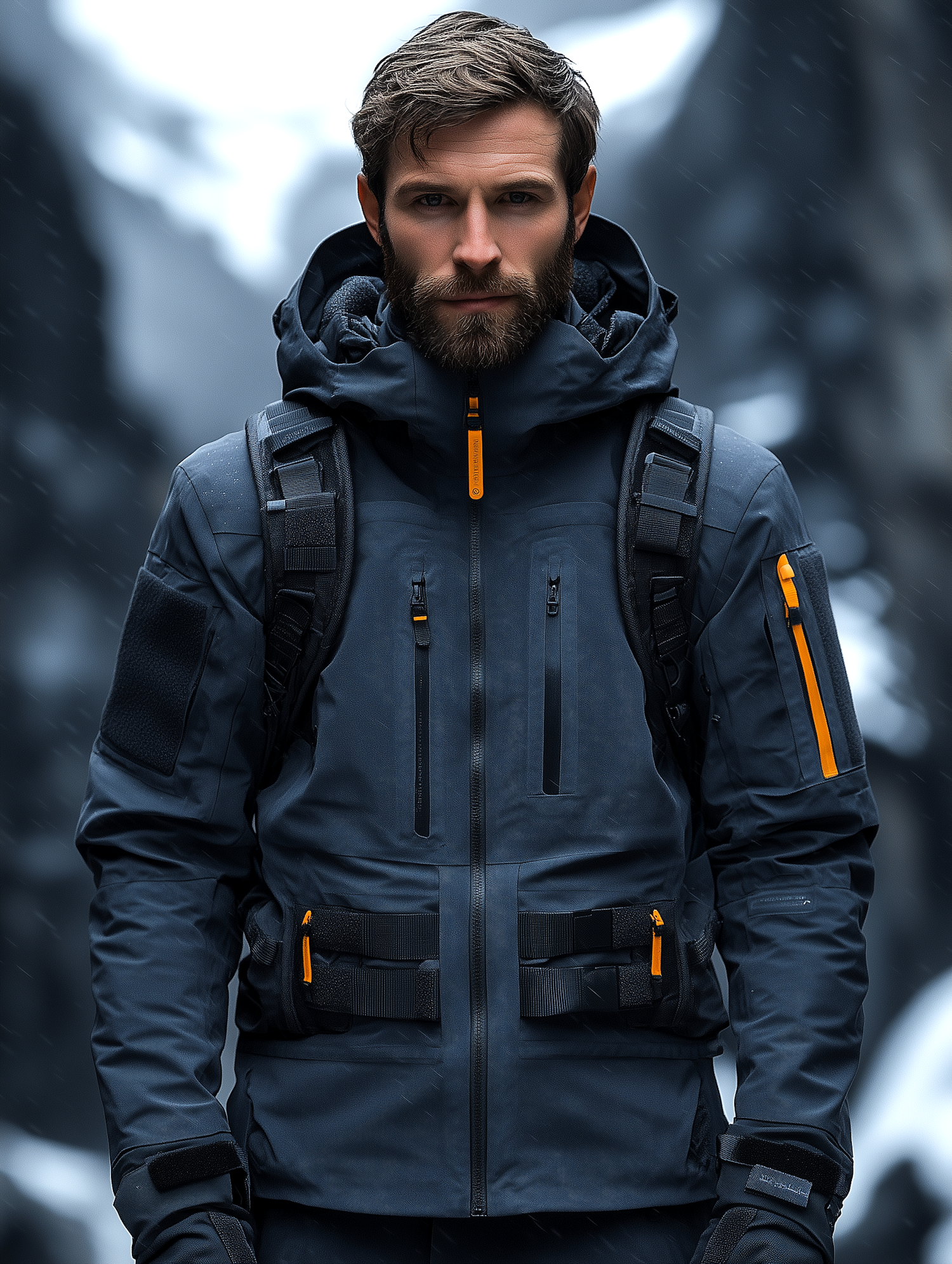 Rugged man in a dark outdoor jacket with orange accents, standing in a snowy mountain setting, exuding adventure and resilience.