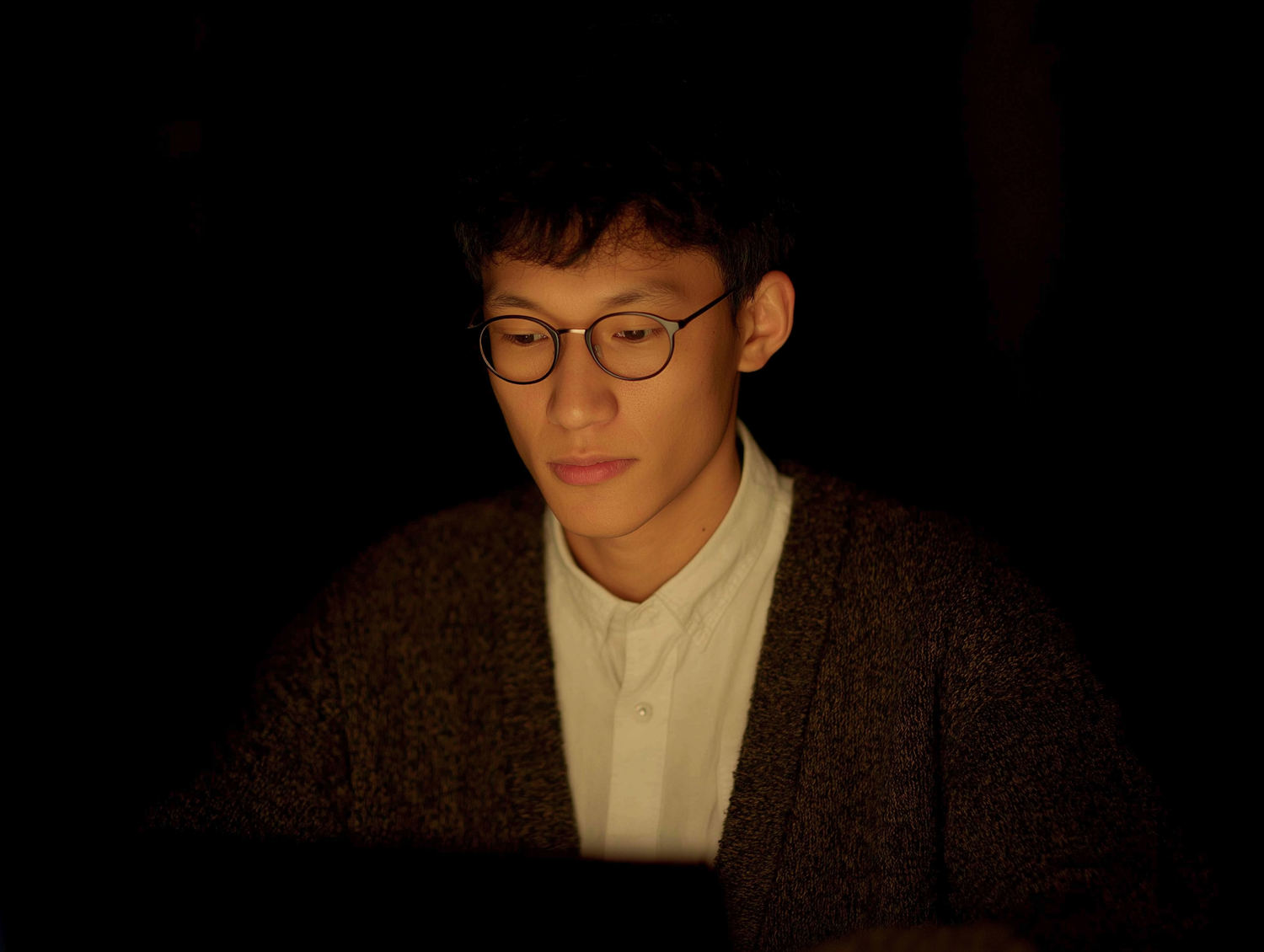 A young man with glasses and a cardigan is illuminated by a soft light in a dark setting, creating a focused and serene atmosphere.