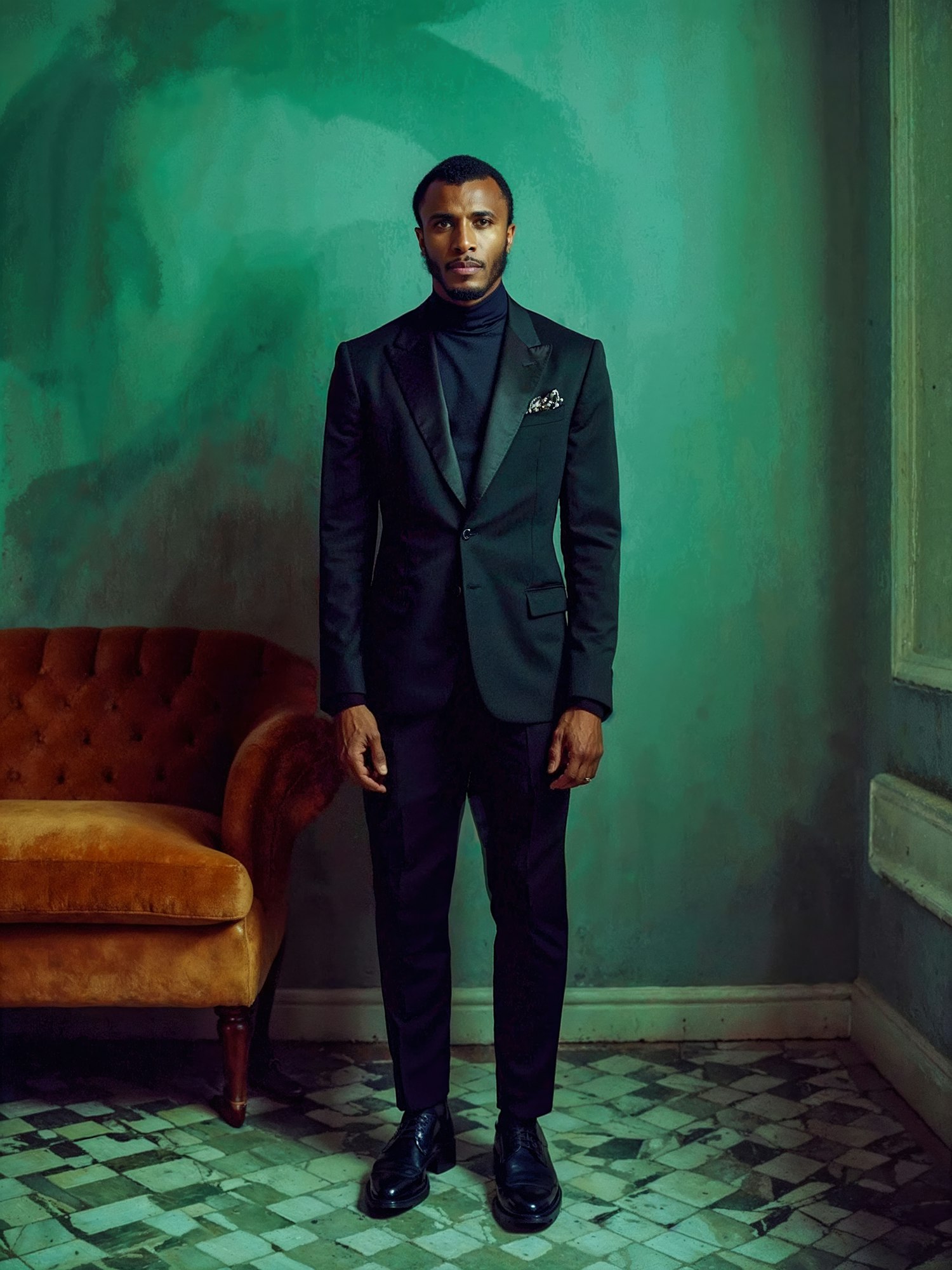 Stylish man in a black suit stands in a vintage room with a plush orange sofa and geometric tiled floor.