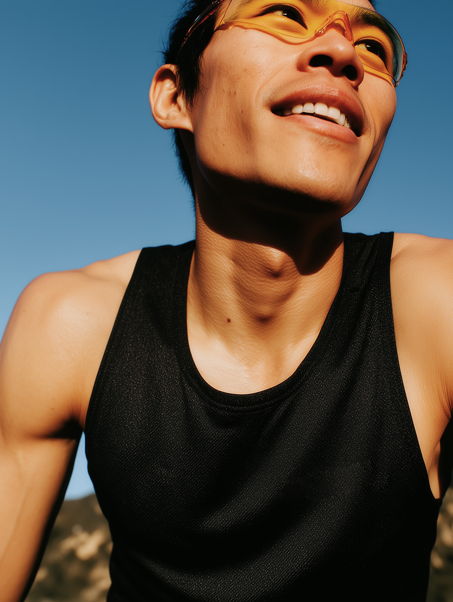 Close-up of a man in a black athletic shirt and yellow sports glasses, smiling under a clear blue sky with sunlight on his face.