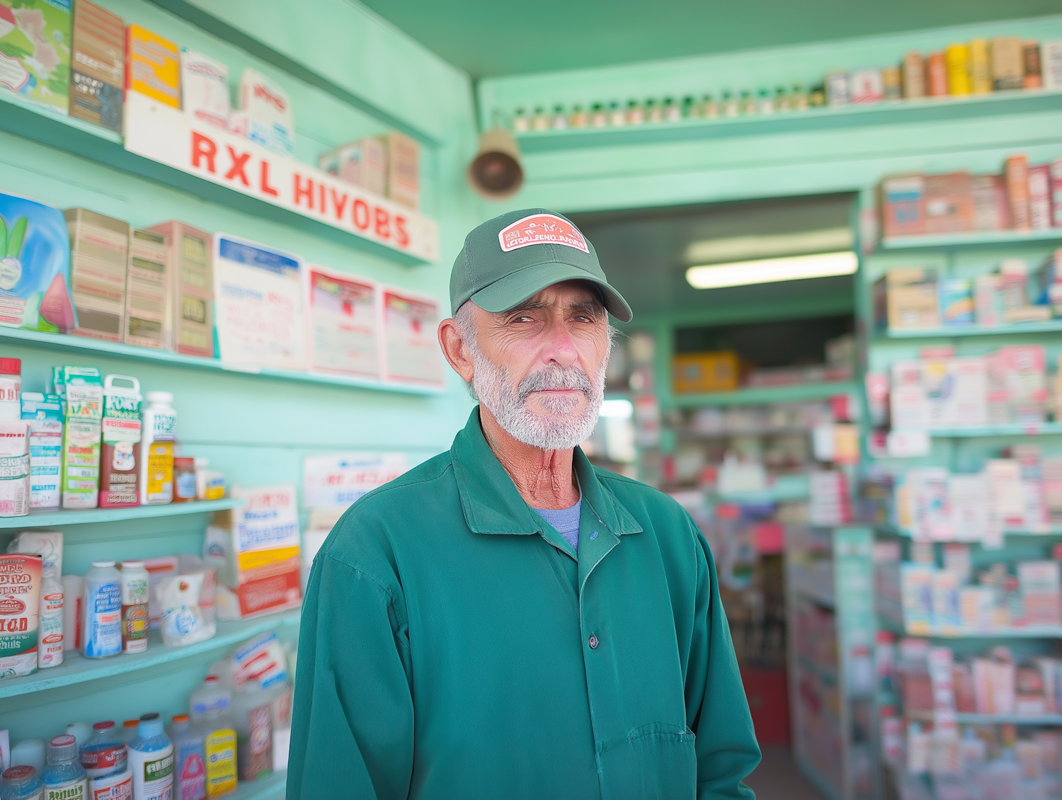 Elderly man in green attire stands in a pharmacy with shelves of colorful products, under bright lighting.