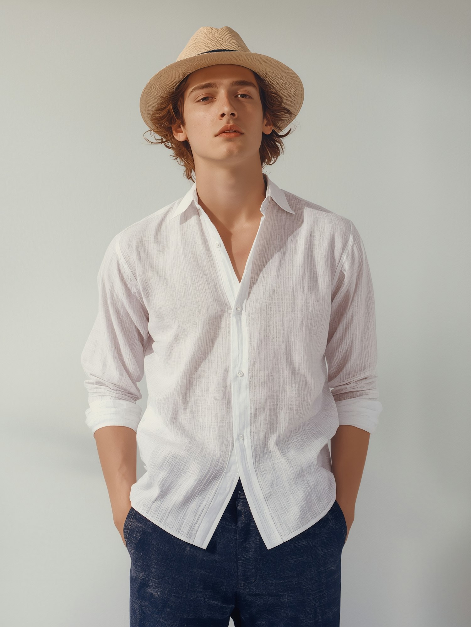Young man in a white shirt and straw hat, posing casually against a light background, exuding a relaxed summer vibe.