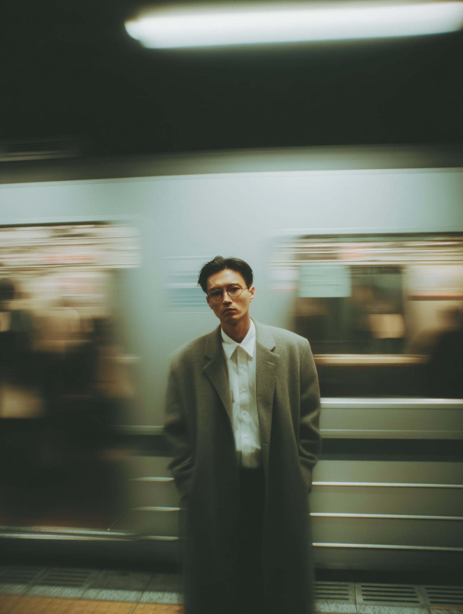 A man in a gray coat and glasses stands in a subway station with a moving train in the background, creating a dynamic urban scene.