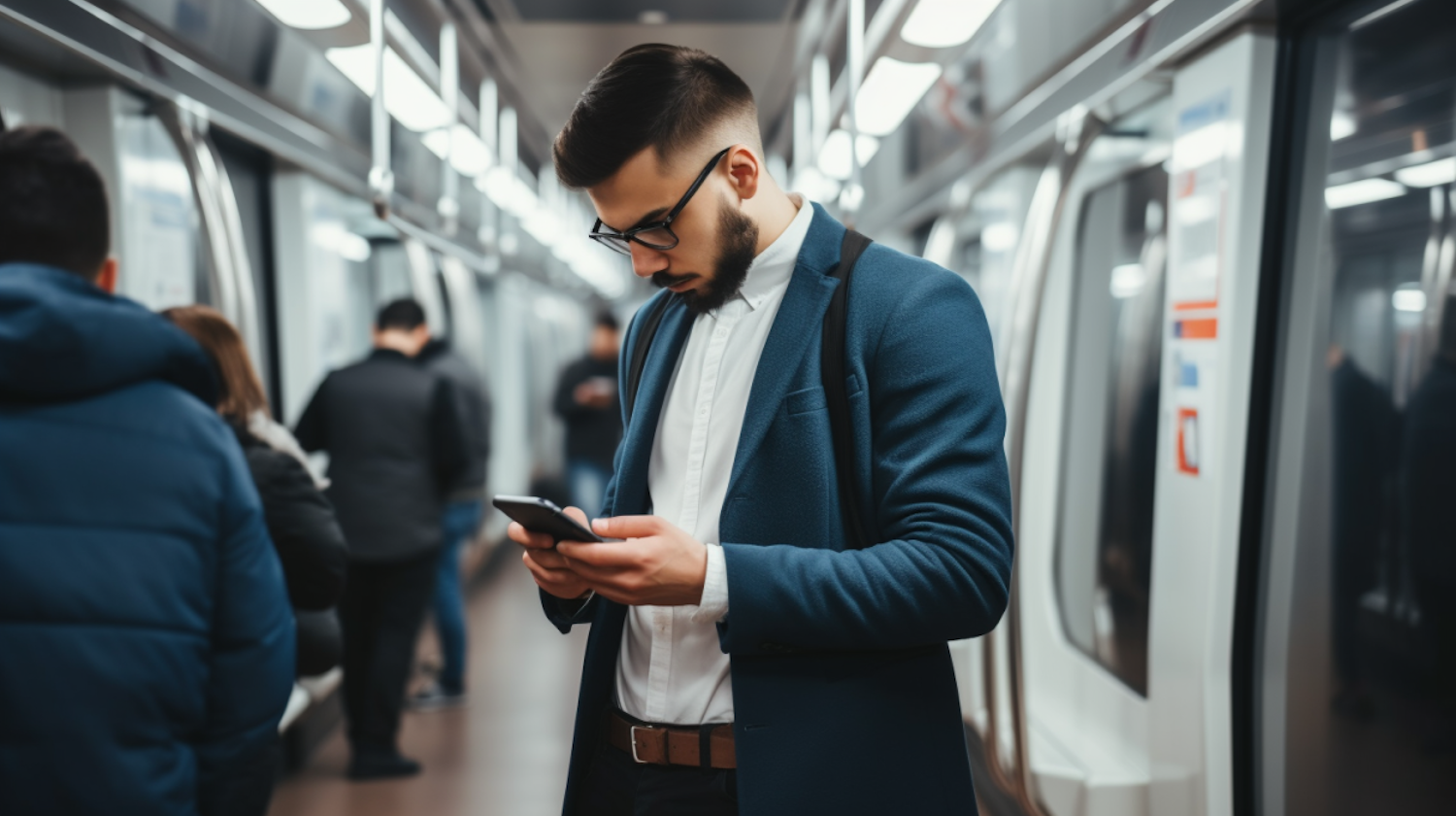 Young man in a blue blazer engrossed in his phone on a modern subway train.
