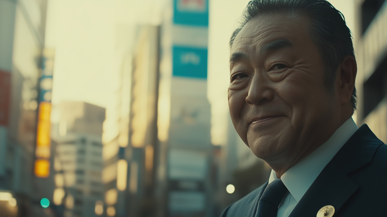 Smiling older Asian man in a suit with cityscape background, warm lighting, and a friendly expression.