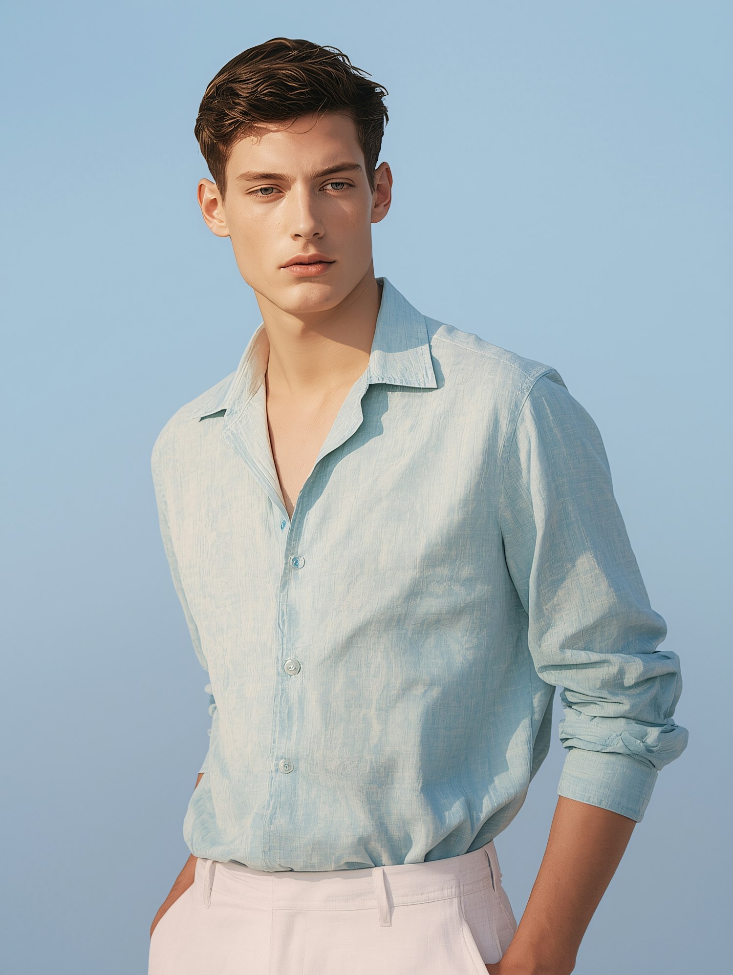 Stylish young man in a light blue linen shirt and white trousers against a clear blue sky, exuding a fresh and summery vibe.