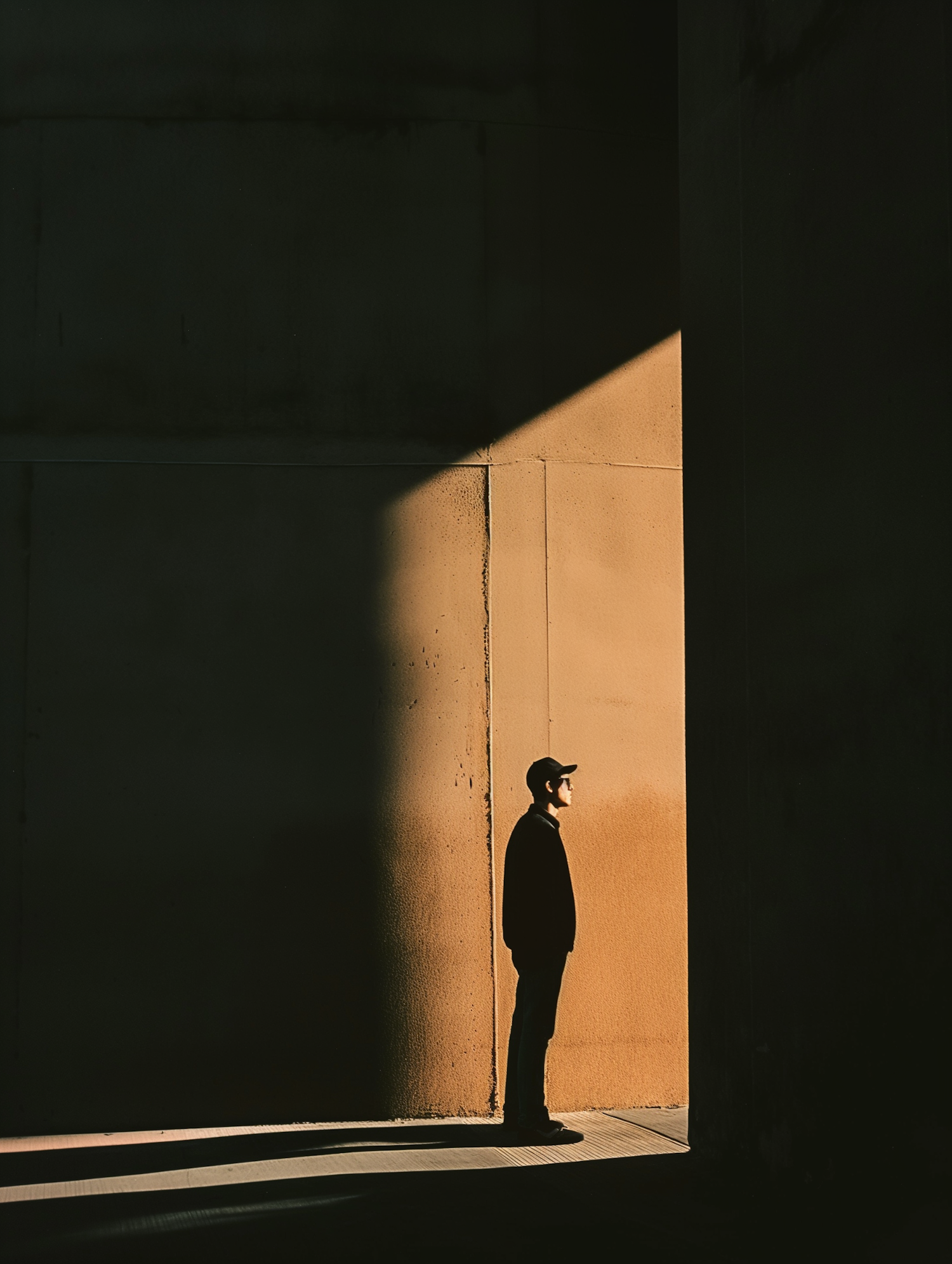 Silhouette of a person in a cap standing in a beam of sunlight against a dark wall, creating dramatic light and shadow contrast.