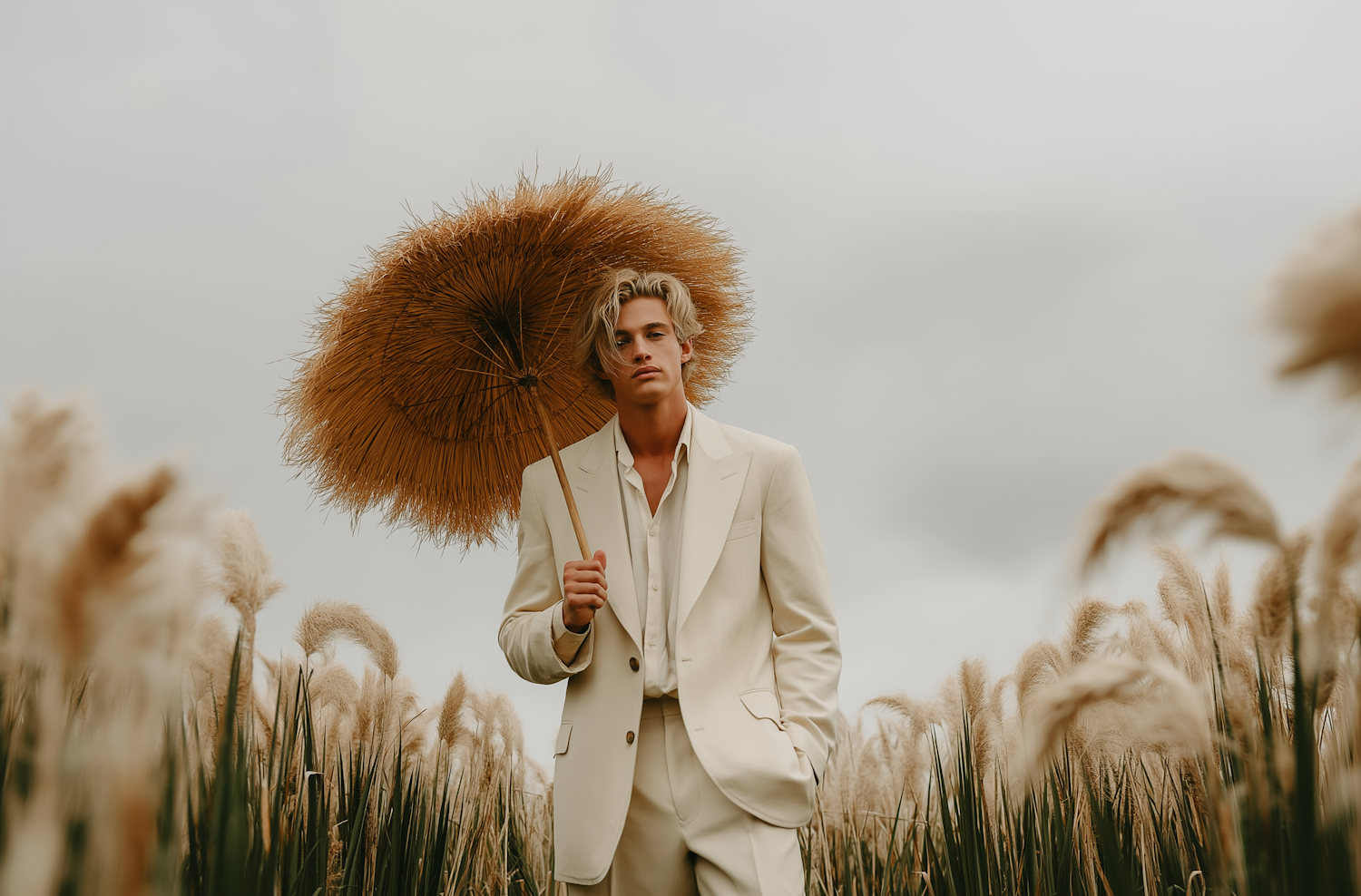 A man in a beige suit holding a straw parasol stands in a field of tall grass under an overcast sky, creating a serene and elegant scene.