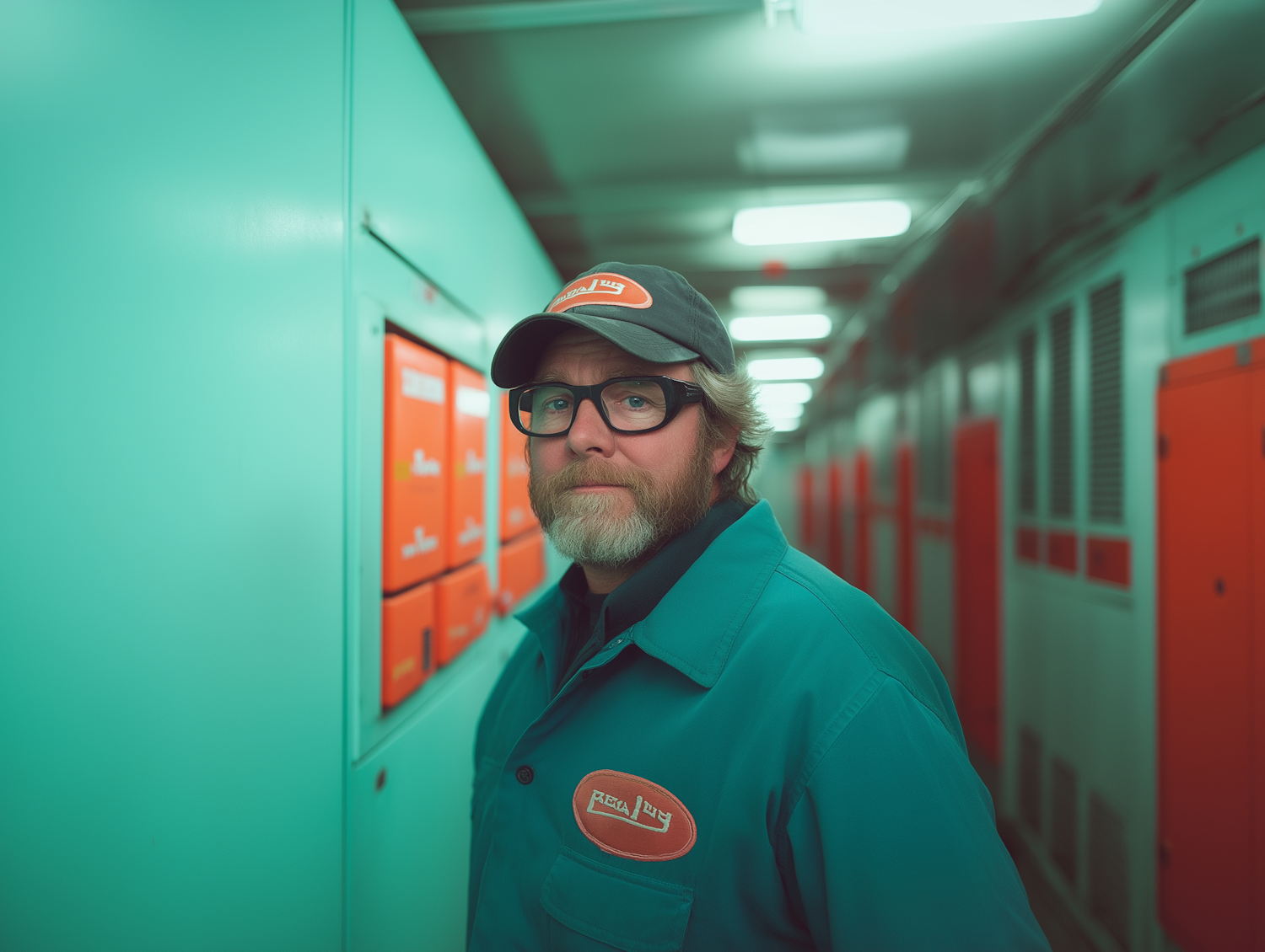Man in teal uniform and cap stands in a brightly lit industrial corridor with teal and orange accents.