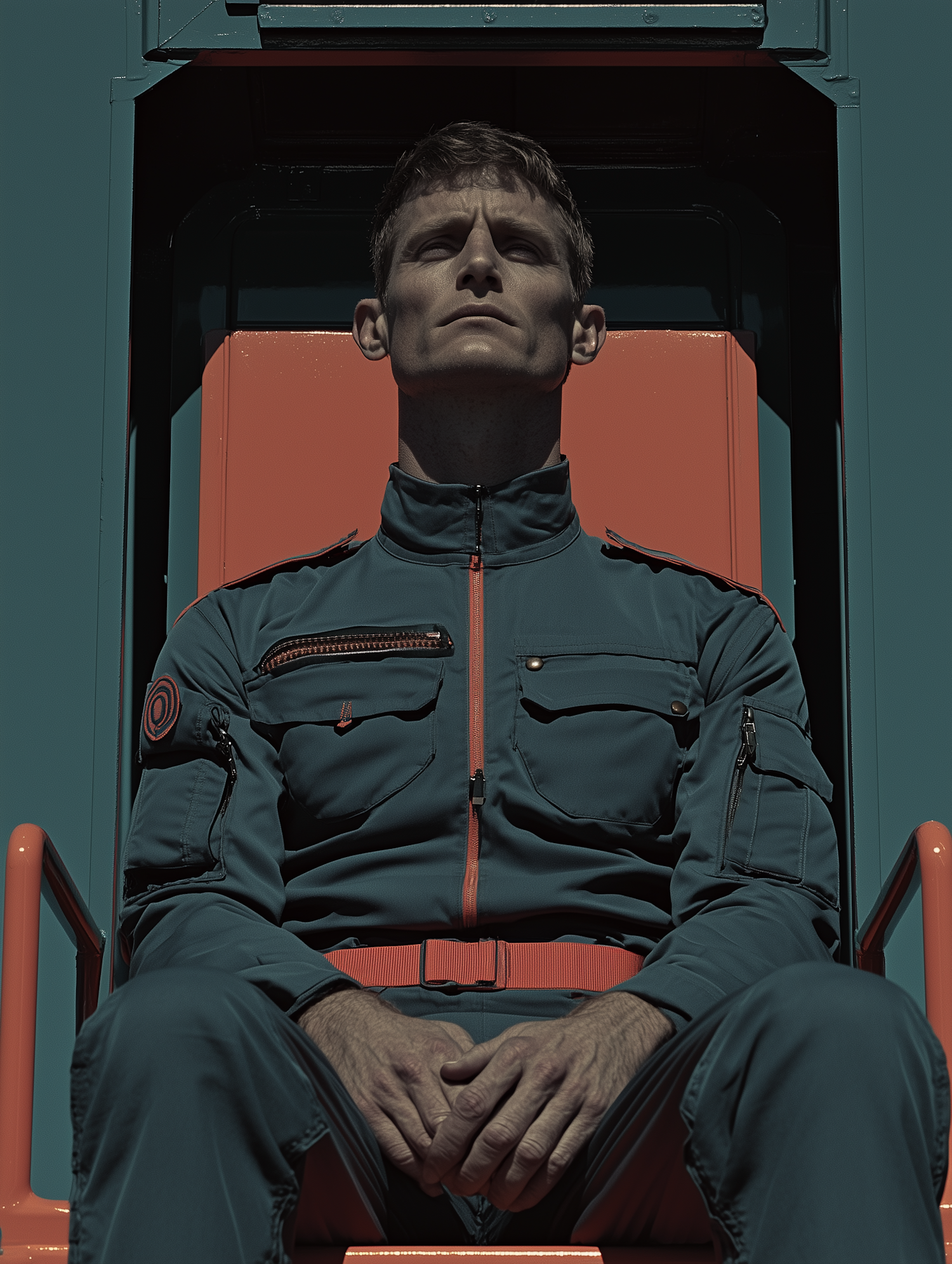 A man in a teal and orange jumpsuit sits confidently in a futuristic chair, exuding authority and focus.