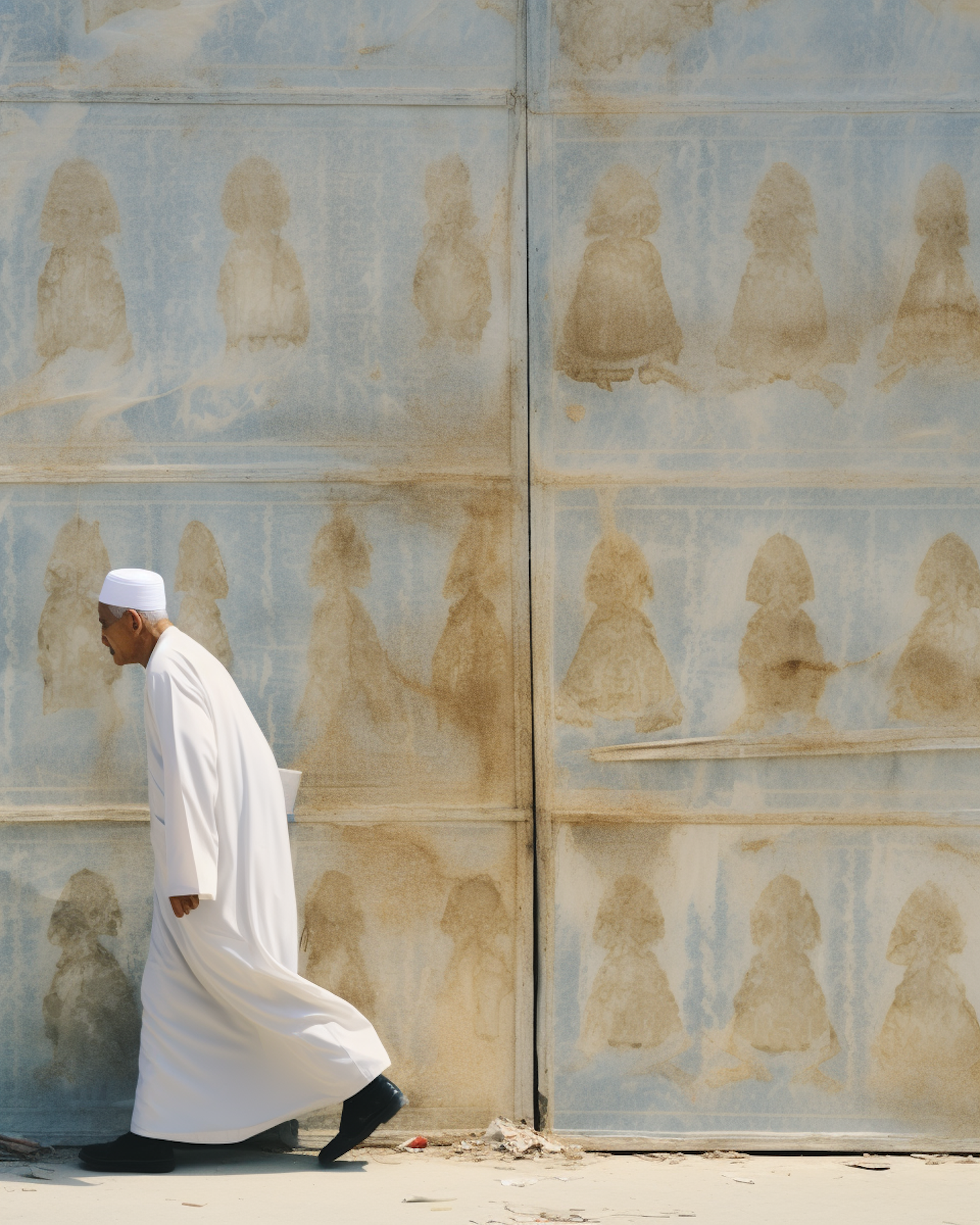Man in white traditional attire walking past a textured wall with abstract brown patterns, creating a serene and contemplative scene.