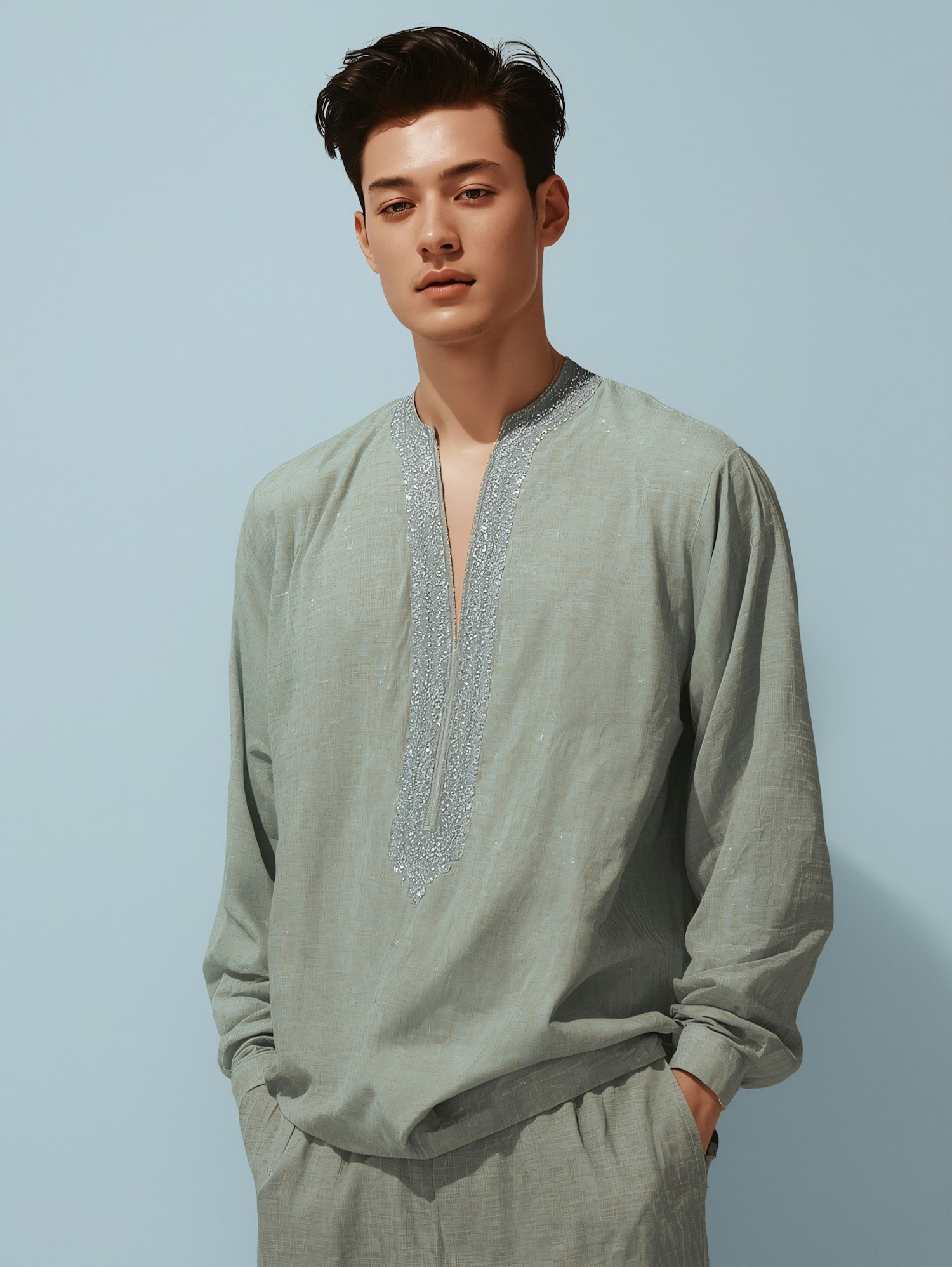 Man in a light green embroidered traditional shirt and matching trousers, standing against a light blue background with a relaxed pose.