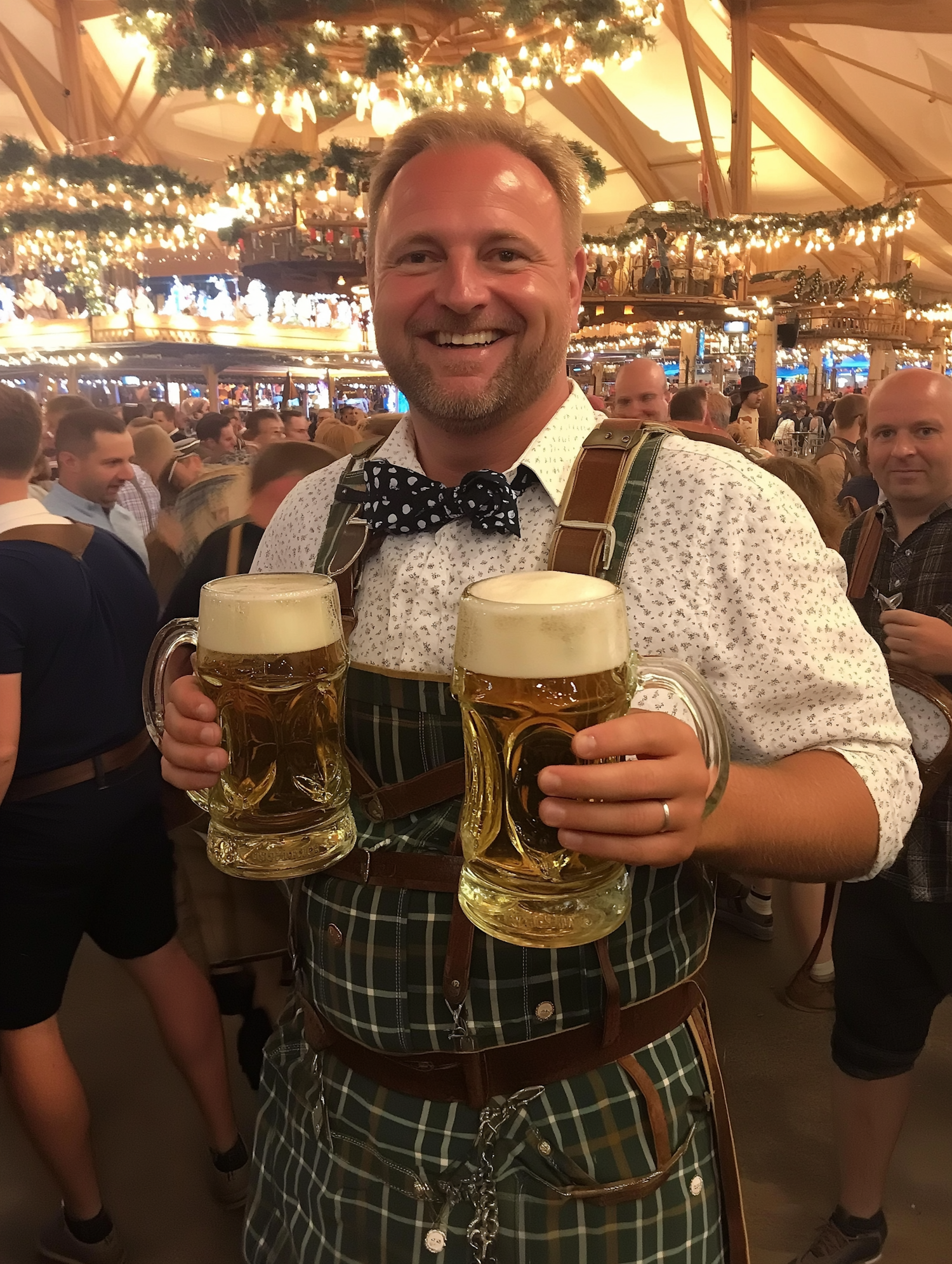 Man in Bavarian attire holding beer mugs at a festive beer hall, surrounded by lively crowd and decorative lights.