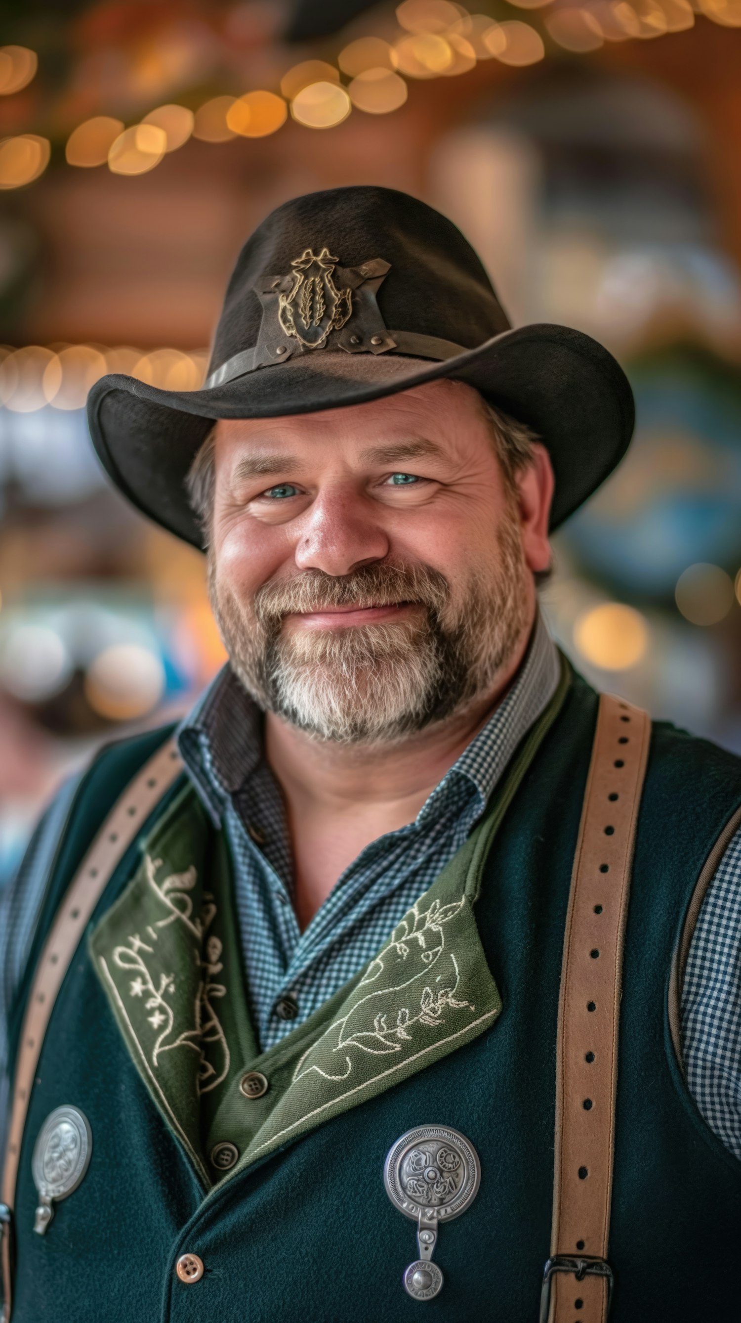 Smiling man in traditional Bavarian attire with a decorative hat and embroidered vest, set against a warm, festive background.