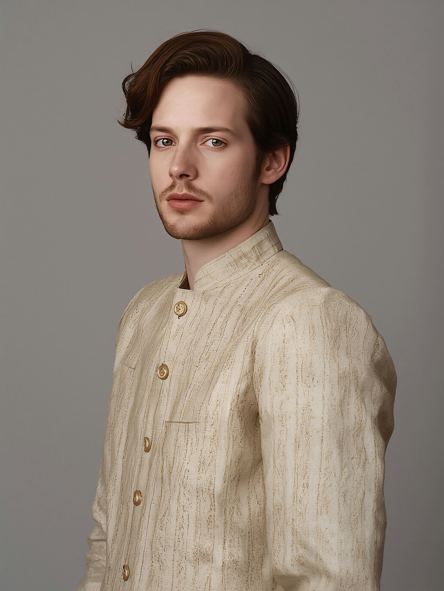 A young man in a beige traditional jacket with gold buttons poses against a gray background, showcasing a formal and elegant style.