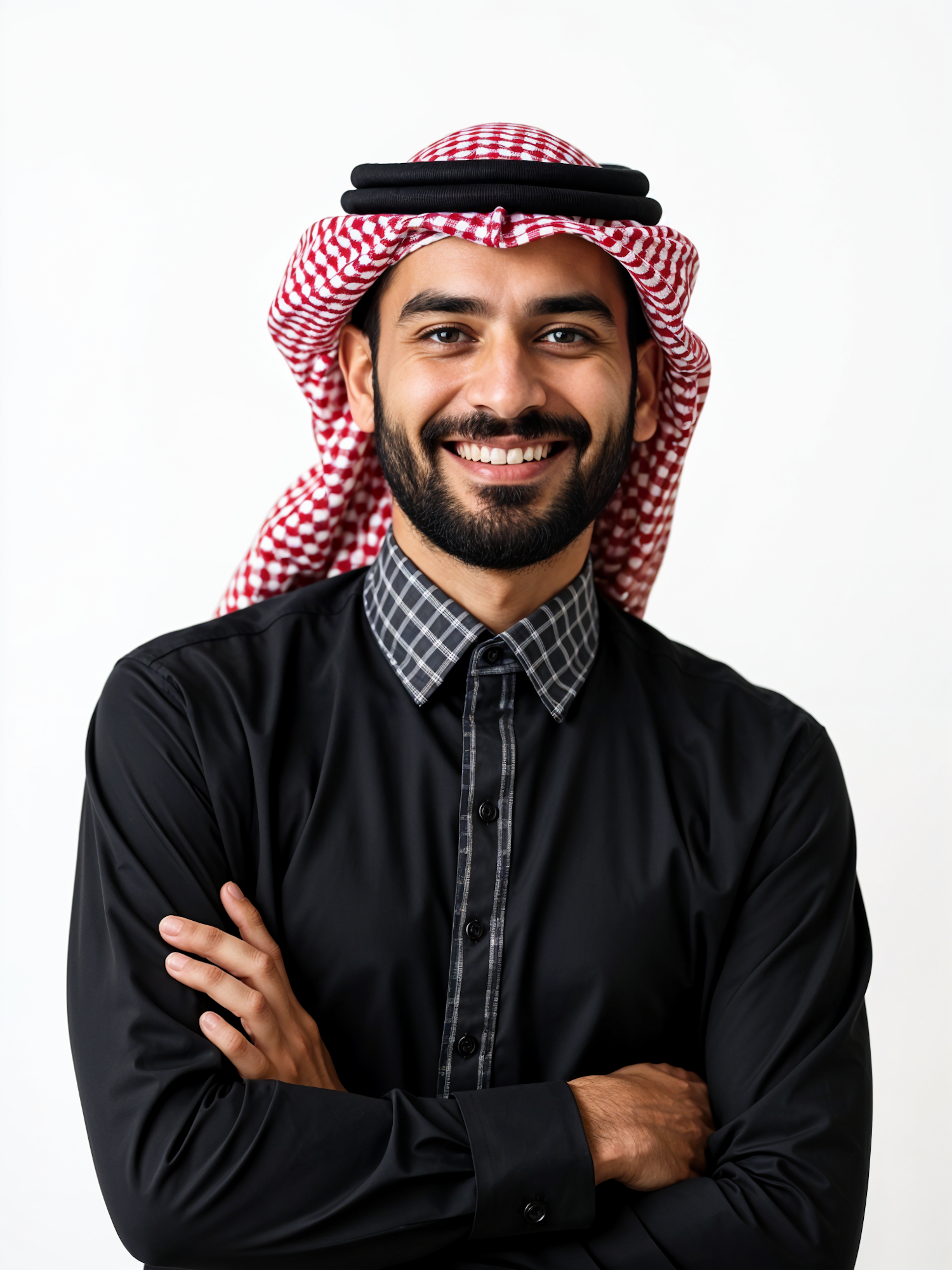 Smiling man in a red and white keffiyeh and black shirt with a patterned collar, standing confidently against a white background.