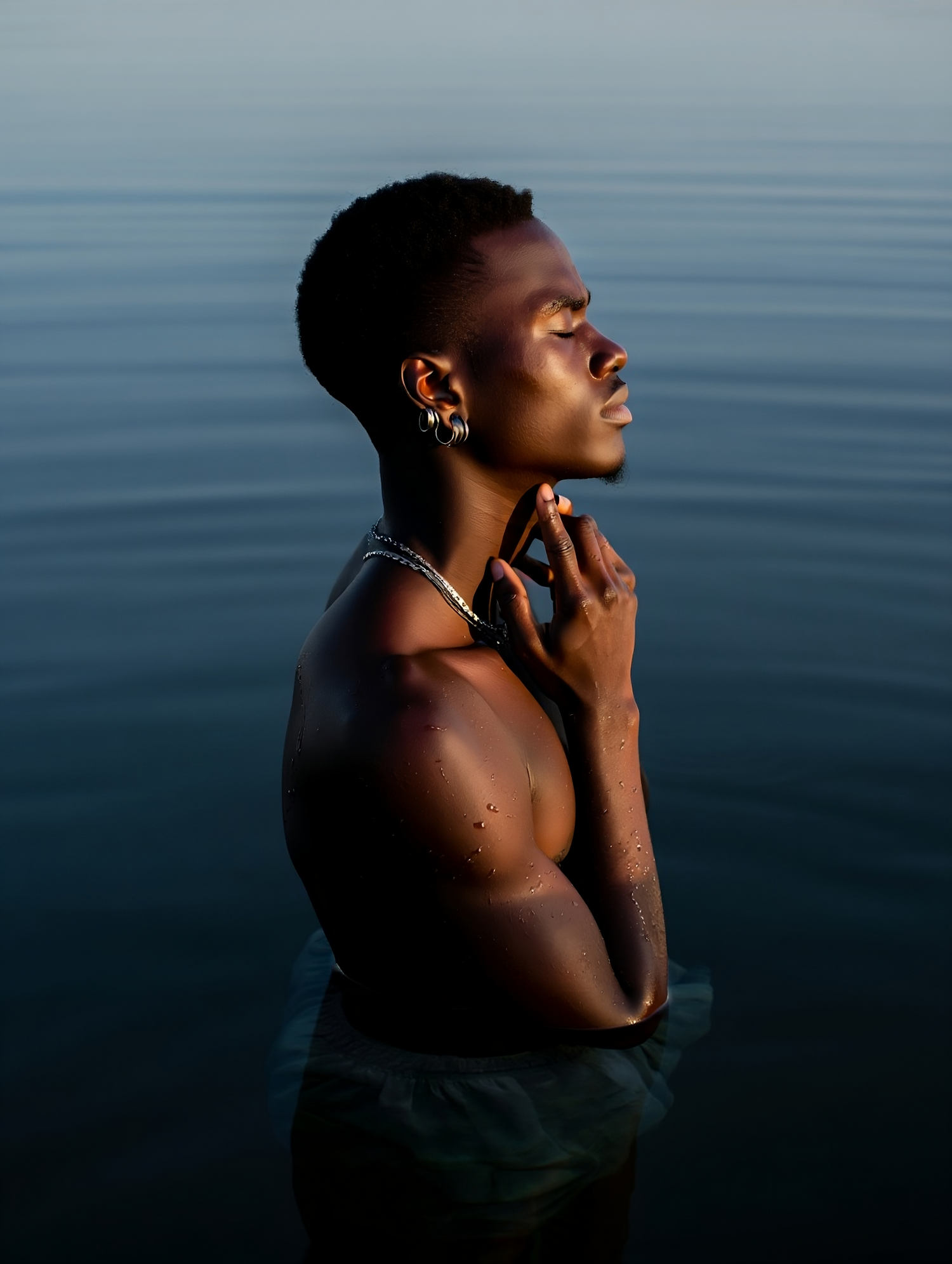 A serene portrait of a man standing in calm water, with closed eyes and soft lighting highlighting his toned physique and accessories.