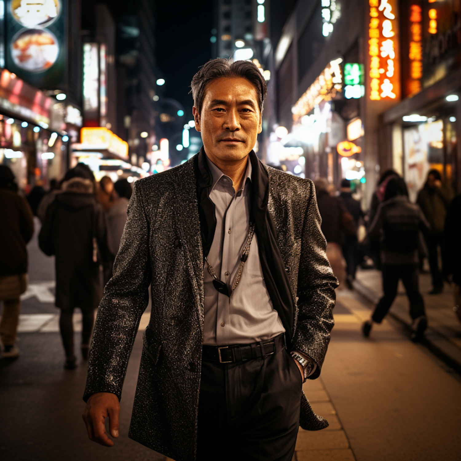 Confident man in a shimmering blazer stands in a bustling city street at night, surrounded by neon lights and a lively crowd.