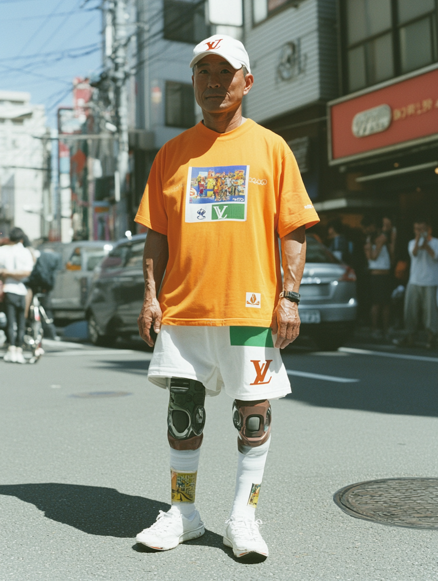 Asian man in orange T-shirt and white shorts with logos, standing on a busy street. Wearing knee braces, white sneakers, and a cap.