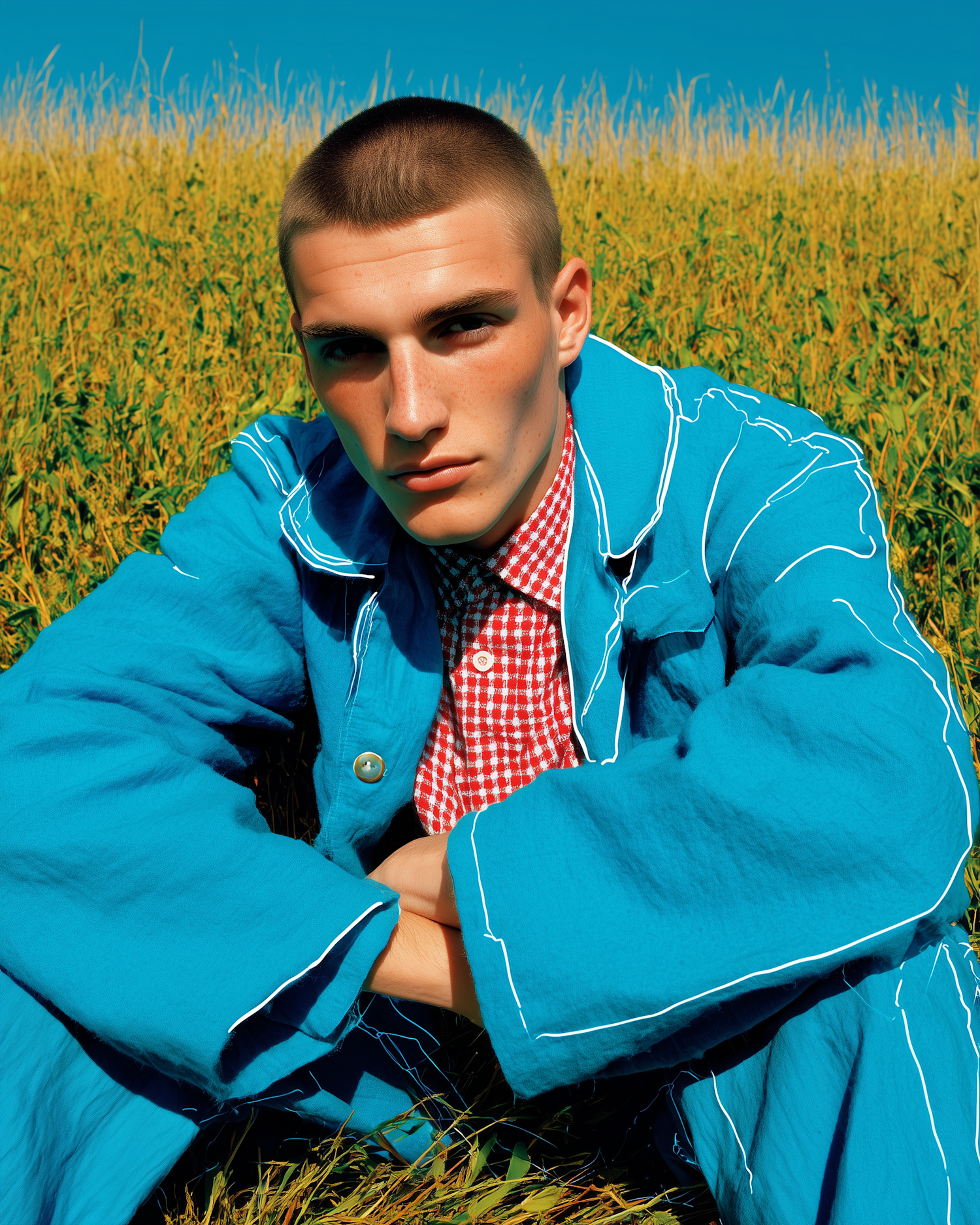 Stylish young man in a vibrant blue jacket and checkered shirt sitting in a sunny field, with a striking blue sky in the background.