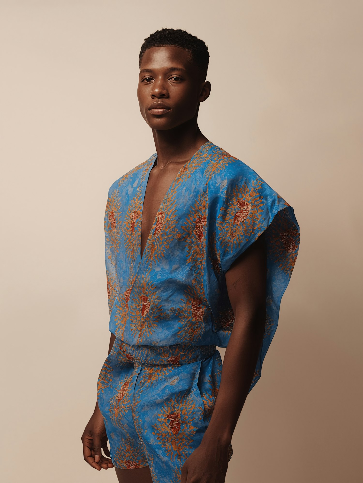 Stylish man in a vibrant blue and orange patterned outfit, standing confidently against a neutral background.