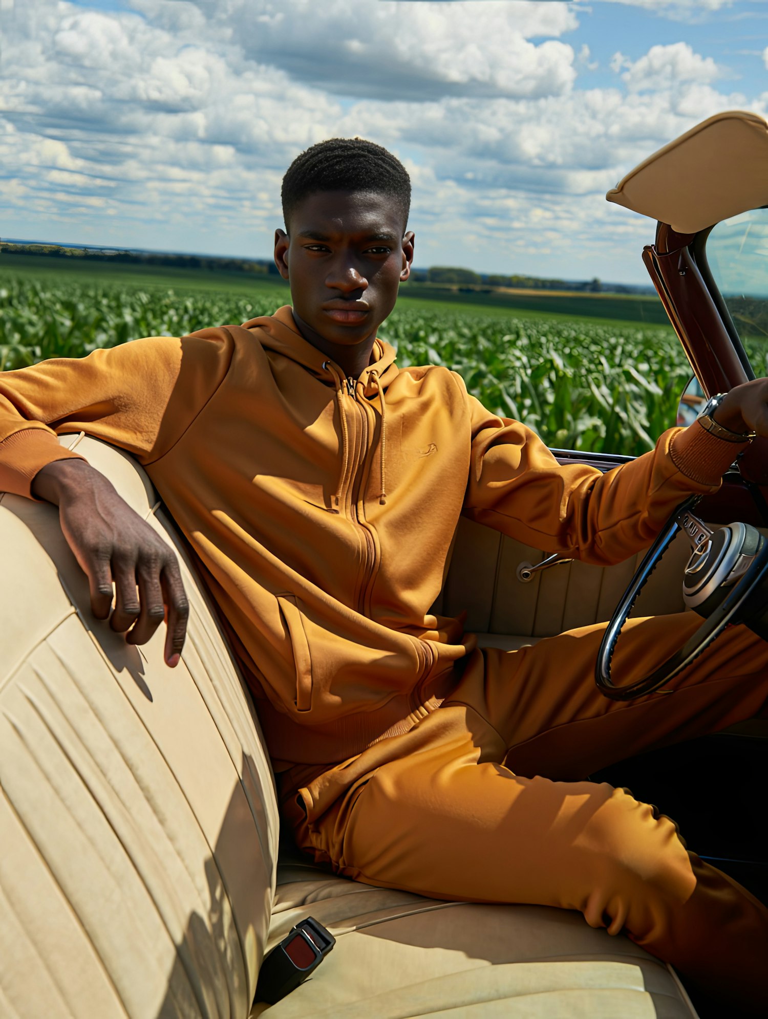 Young man in mustard tracksuit in a vintage convertible with a beige interior, against a lush field backdrop under a cloudy sky.