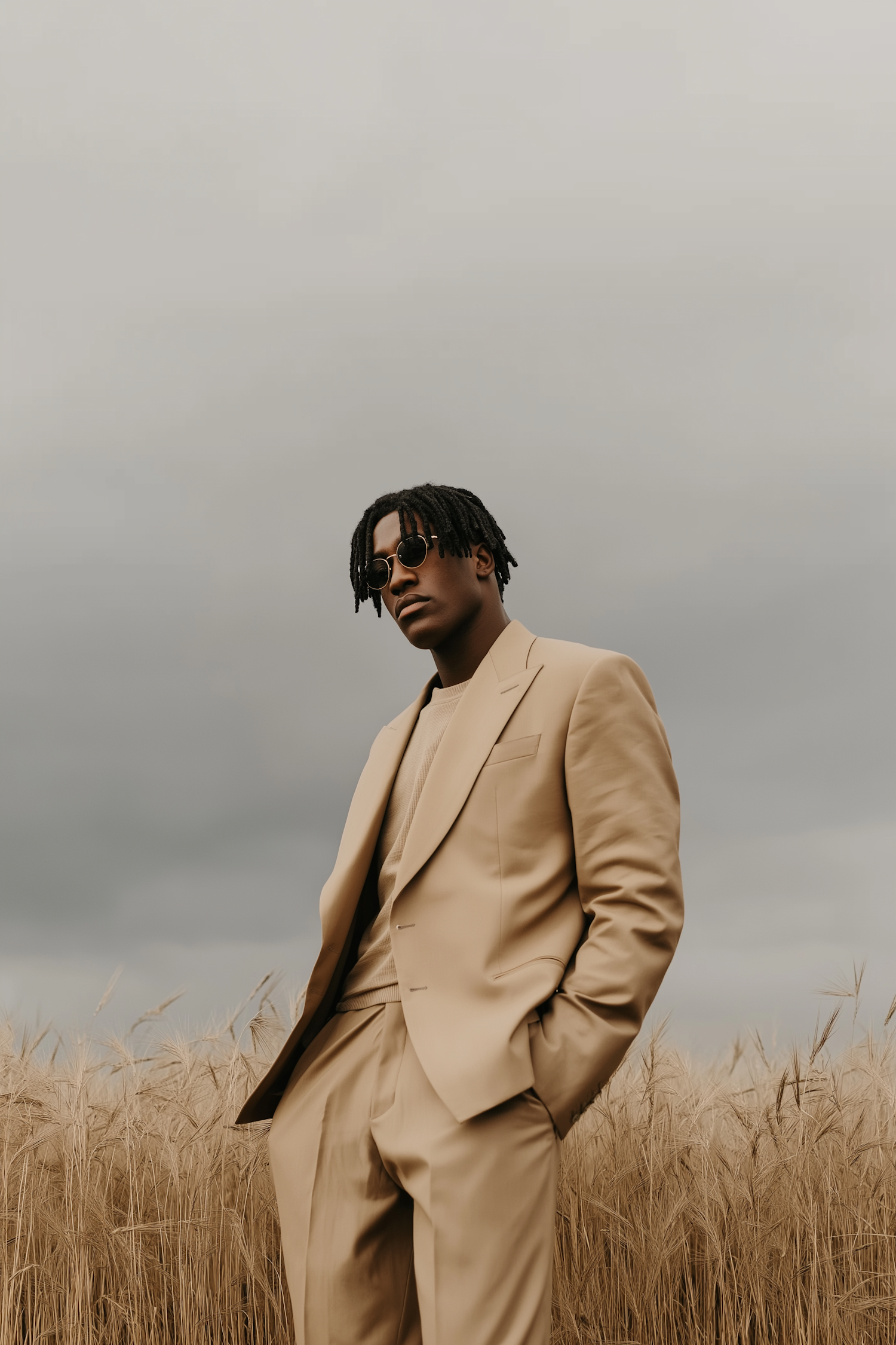 Stylish man in a beige suit and sunglasses standing in a golden wheat field under a cloudy sky, exuding modern elegance.