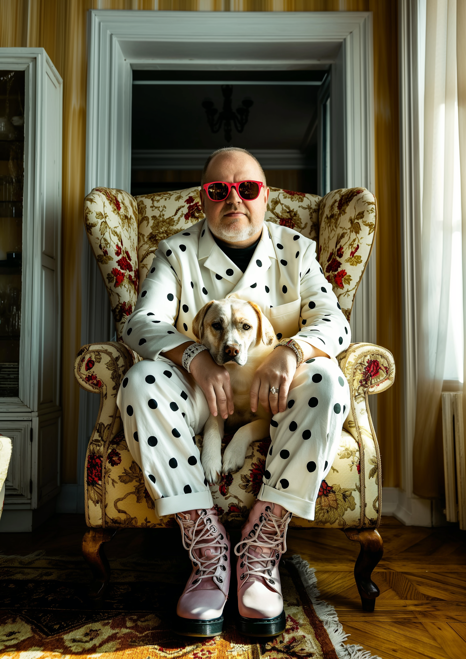 Man in polka dot suit with red sunglasses sits in floral armchair, holding a Labrador Retriever. Cozy room with warm lighting.