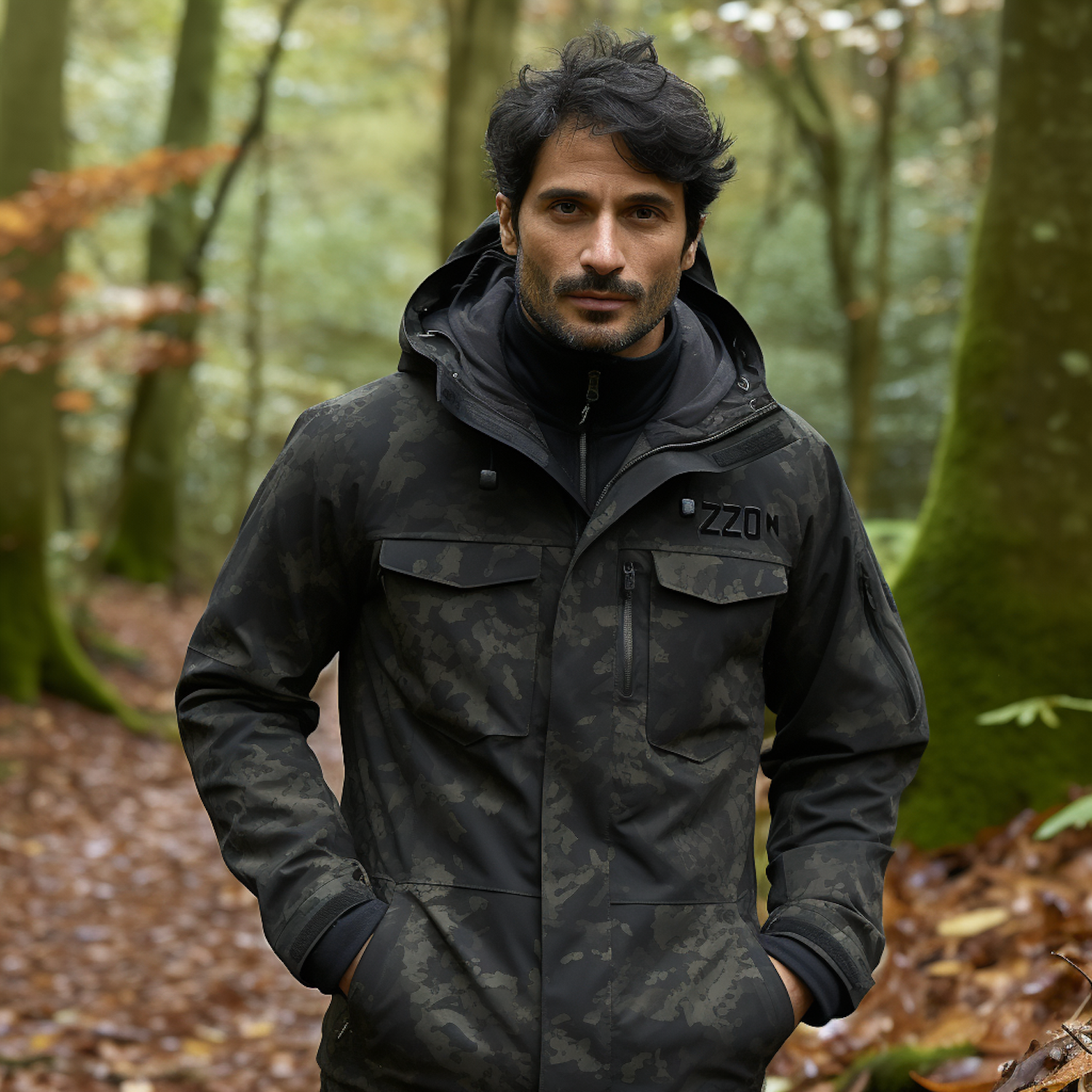 Man in a dark camouflage jacket stands in a forest, exuding confidence and style. Perfect for outdoor adventures.