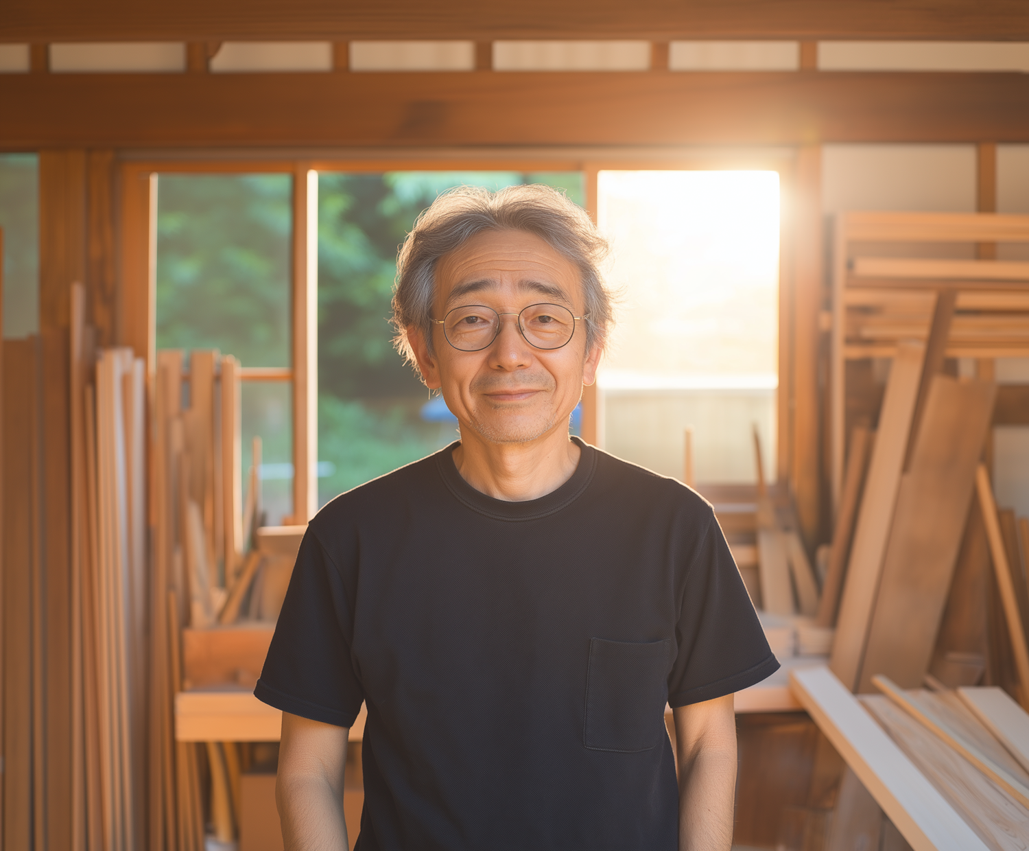 Middle-aged Asian man in a woodworking shop, wearing glasses and a black t-shirt, with sunlight streaming through the window.