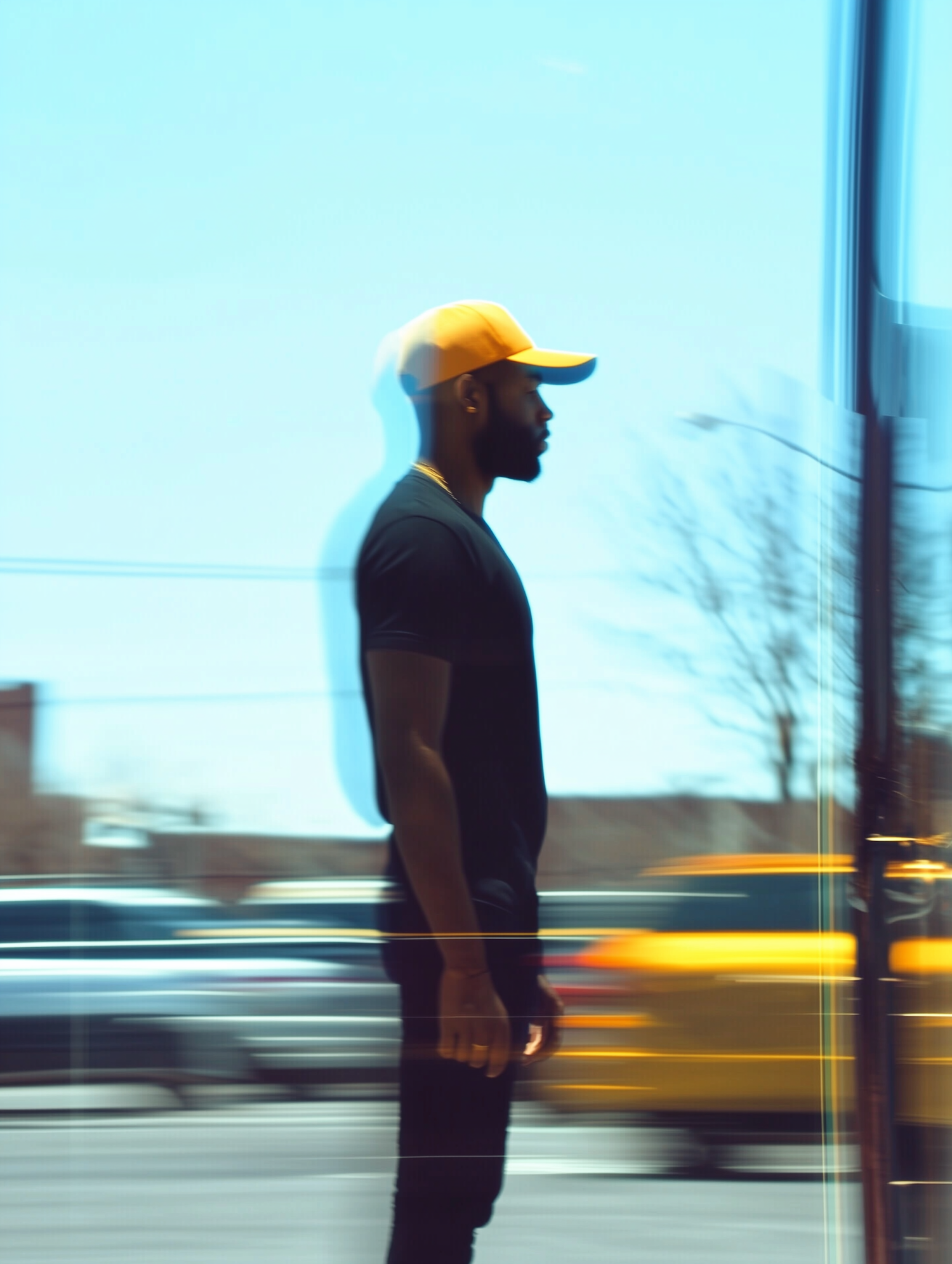 A man in a yellow cap and black shirt stands against a blurred cityscape, creating a dynamic and vibrant urban scene.