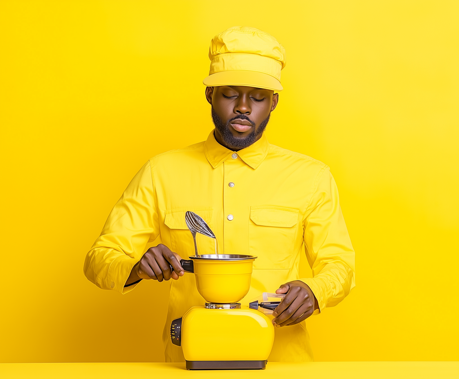 Man in yellow outfit using a yellow kitchen mixer against a vibrant yellow background, creating a striking monochromatic aesthetic.