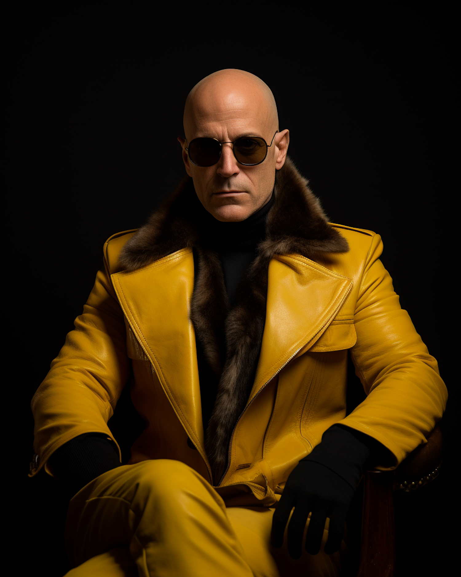 Bald man in yellow leather jacket with fur collar, wearing sunglasses, exudes confidence in a dark setting.