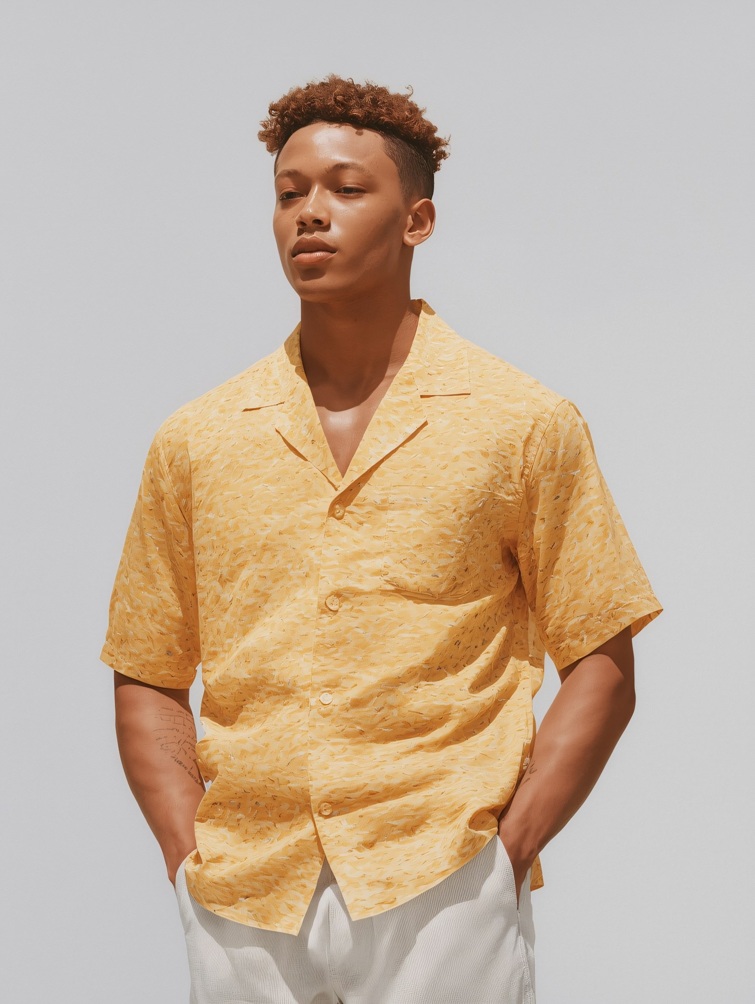 Stylish man in a yellow patterned shirt and light pants, posing confidently against a clean gray background.
