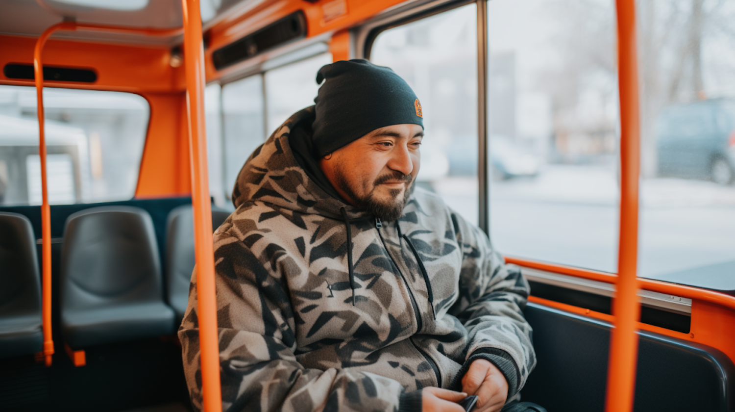 Man in a camouflage jacket and beanie sits contently on a bus with orange accents, gazing out the window.