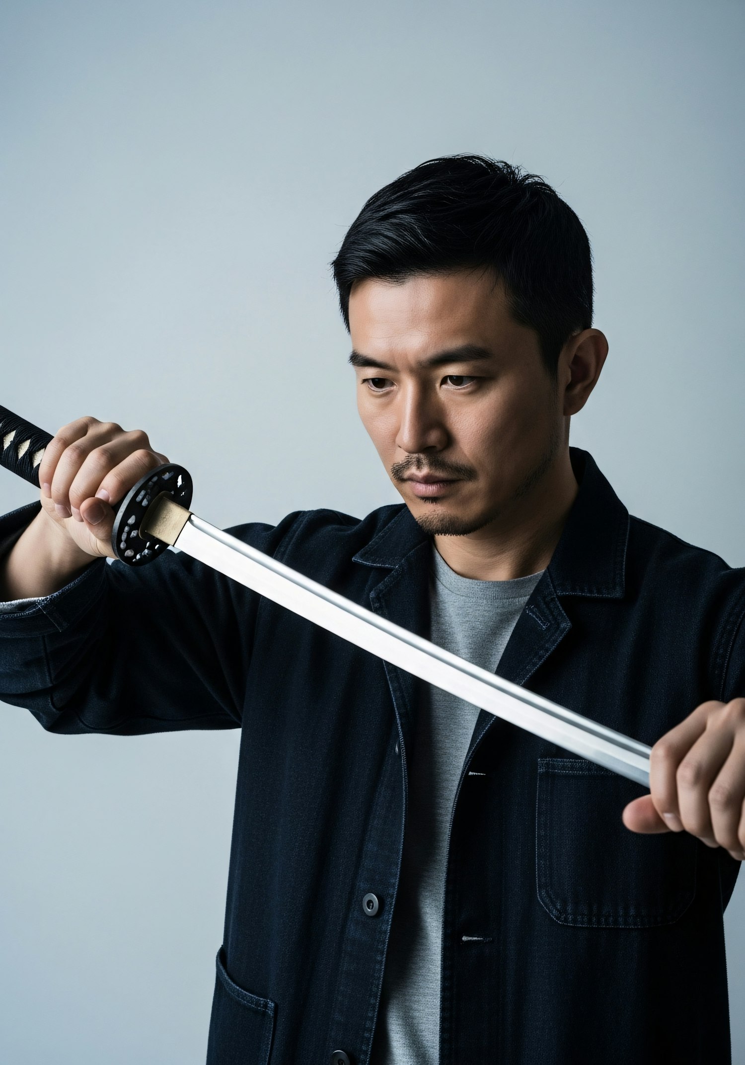 A man in a dark jacket inspects a katana sword with a focused expression, set against a plain light background.