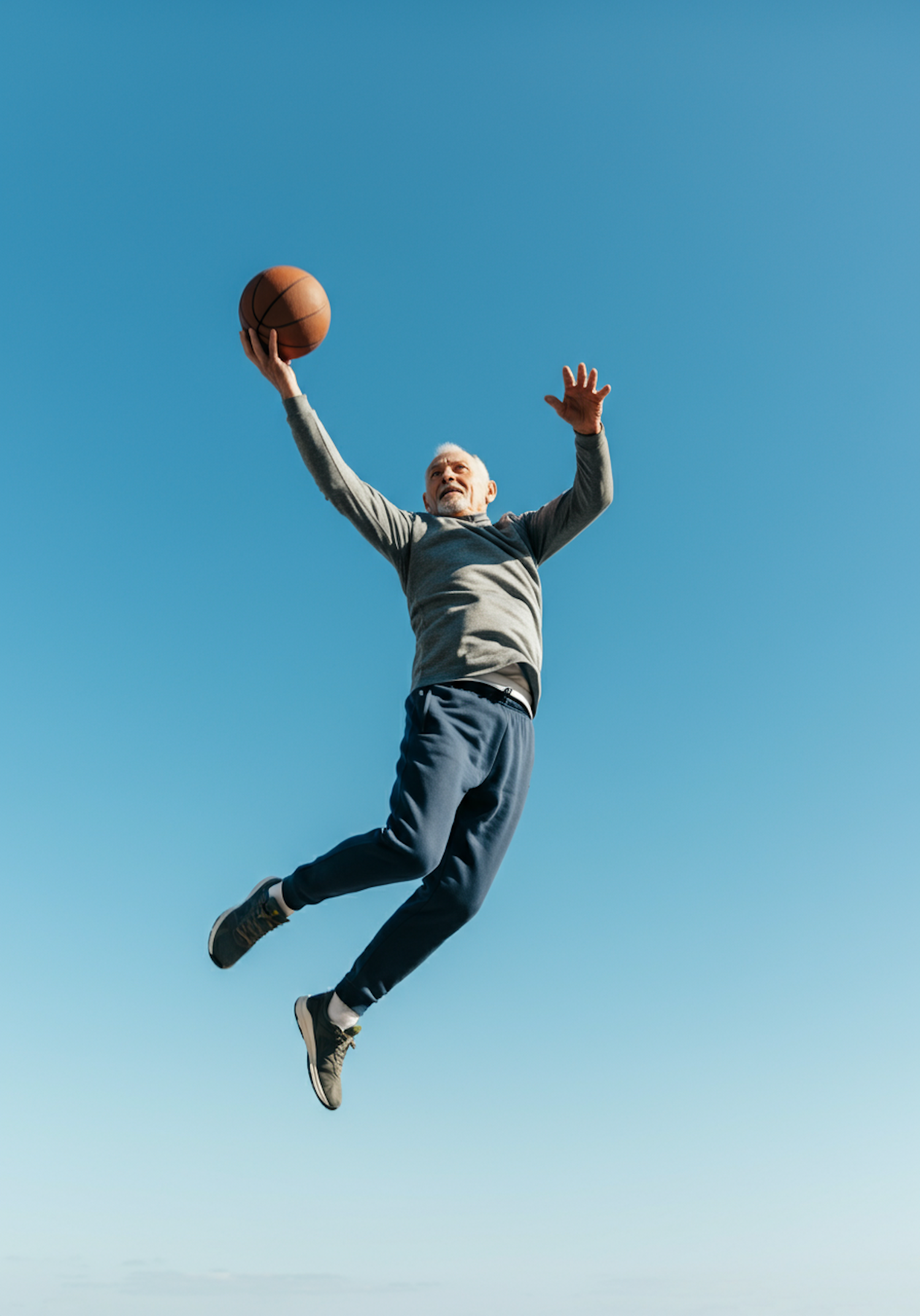 Elderly man jumping mid-air with a basketball, showcasing energy and athleticism against a clear blue sky.