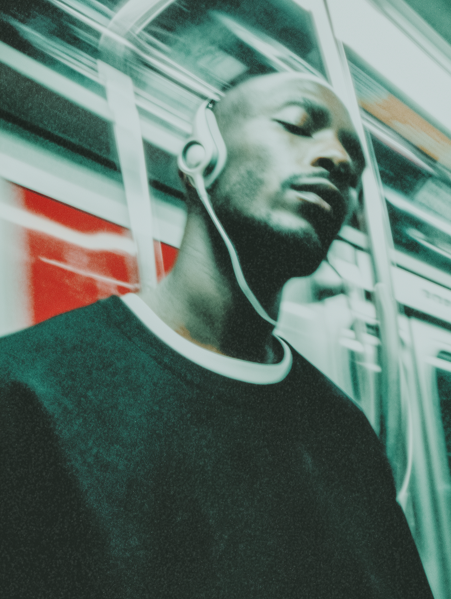 A man with headphones in a dimly lit subway, eyes closed, immersed in music. The greenish tint adds a moody, urban vibe.
