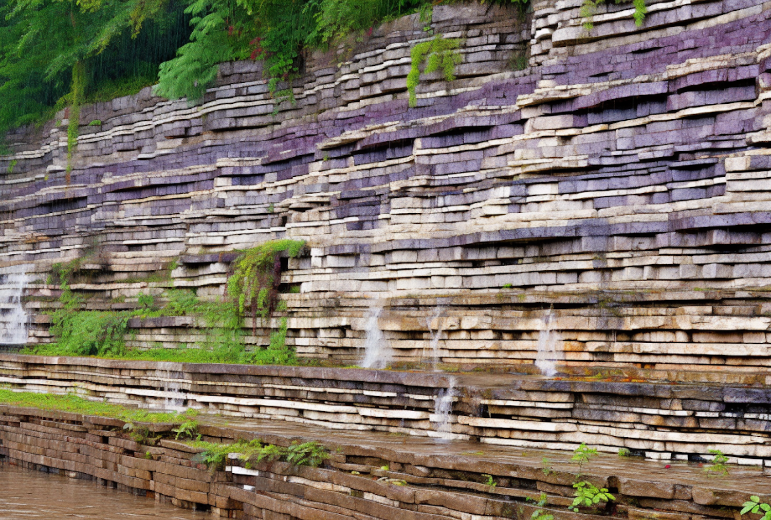 Layered sedimentary rock formation with lush greenery and trickling water, showcasing natural beauty and geological history.