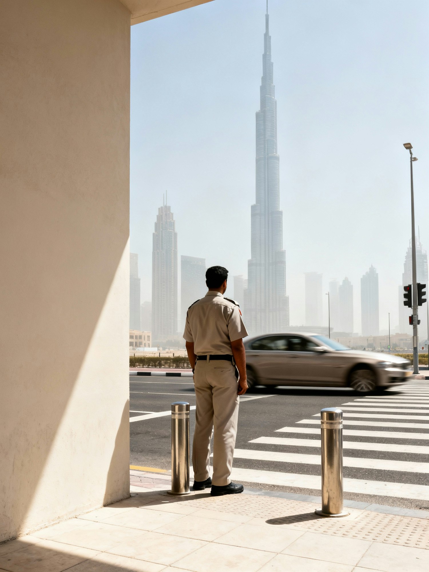 A man in uniform stands near a crosswalk, gazing at the Burj Khalifa in a sunny urban setting, with a car passing by on the road.