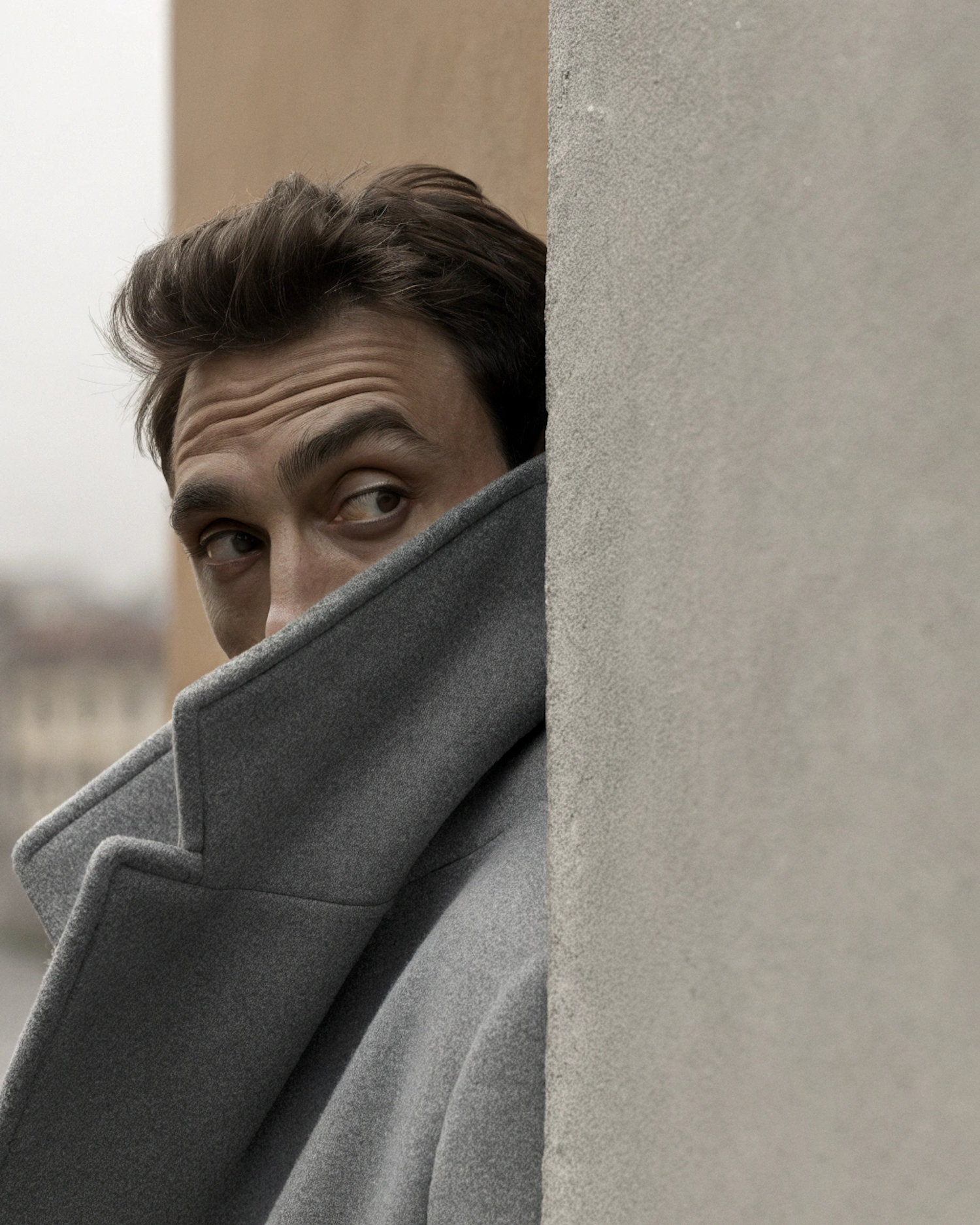 A man in a gray coat peers cautiously from behind a wall, his expression focused. The muted urban background adds intrigue to the scene.