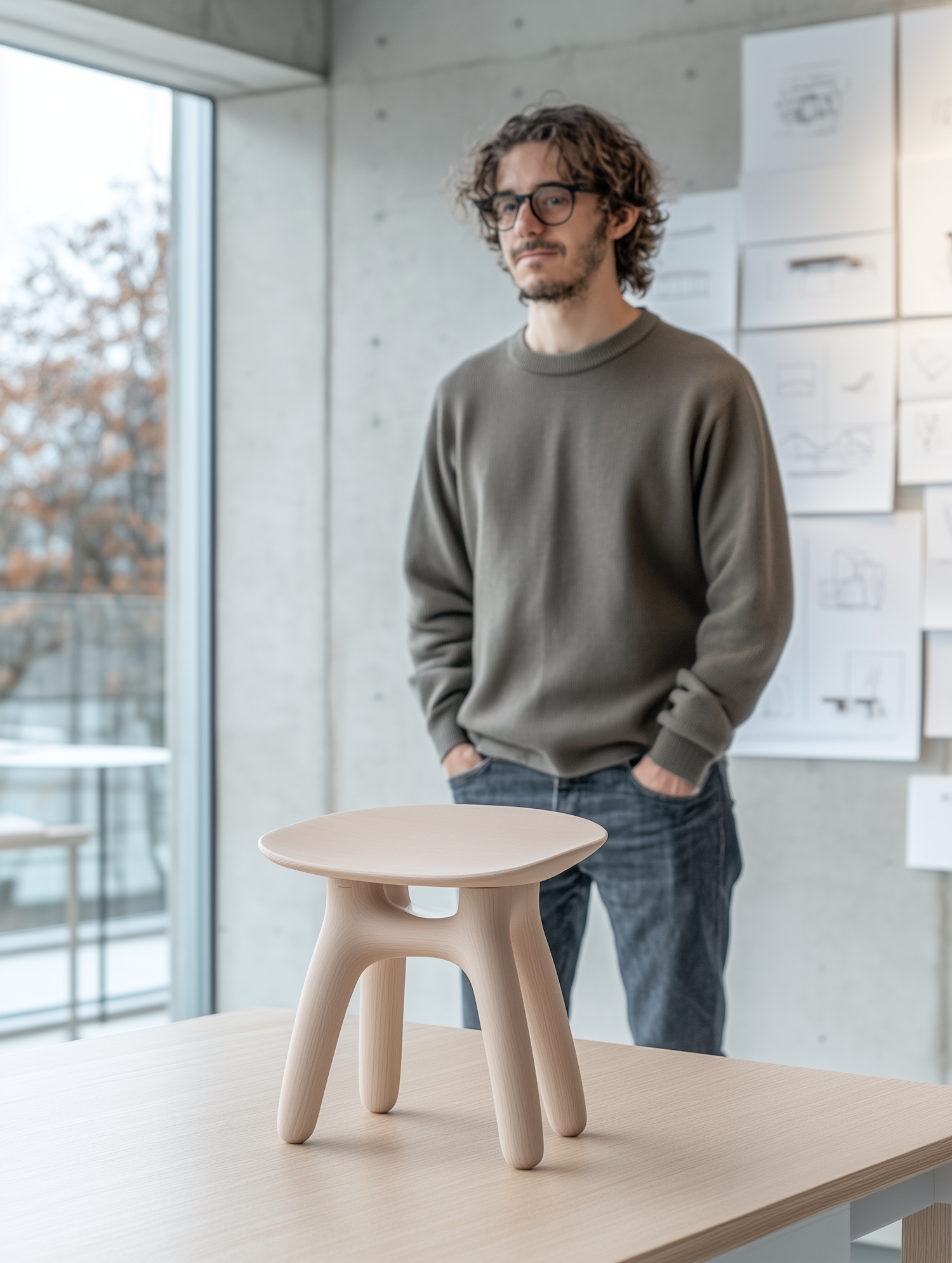 Man in a modern studio with a unique wooden stool, surrounded by design sketches and natural light.