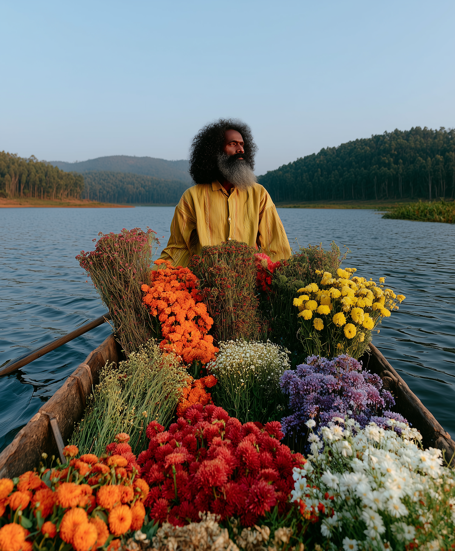 Man on a boat filled with colorful flowers, set against a serene lake and forested hills under a clear sky.