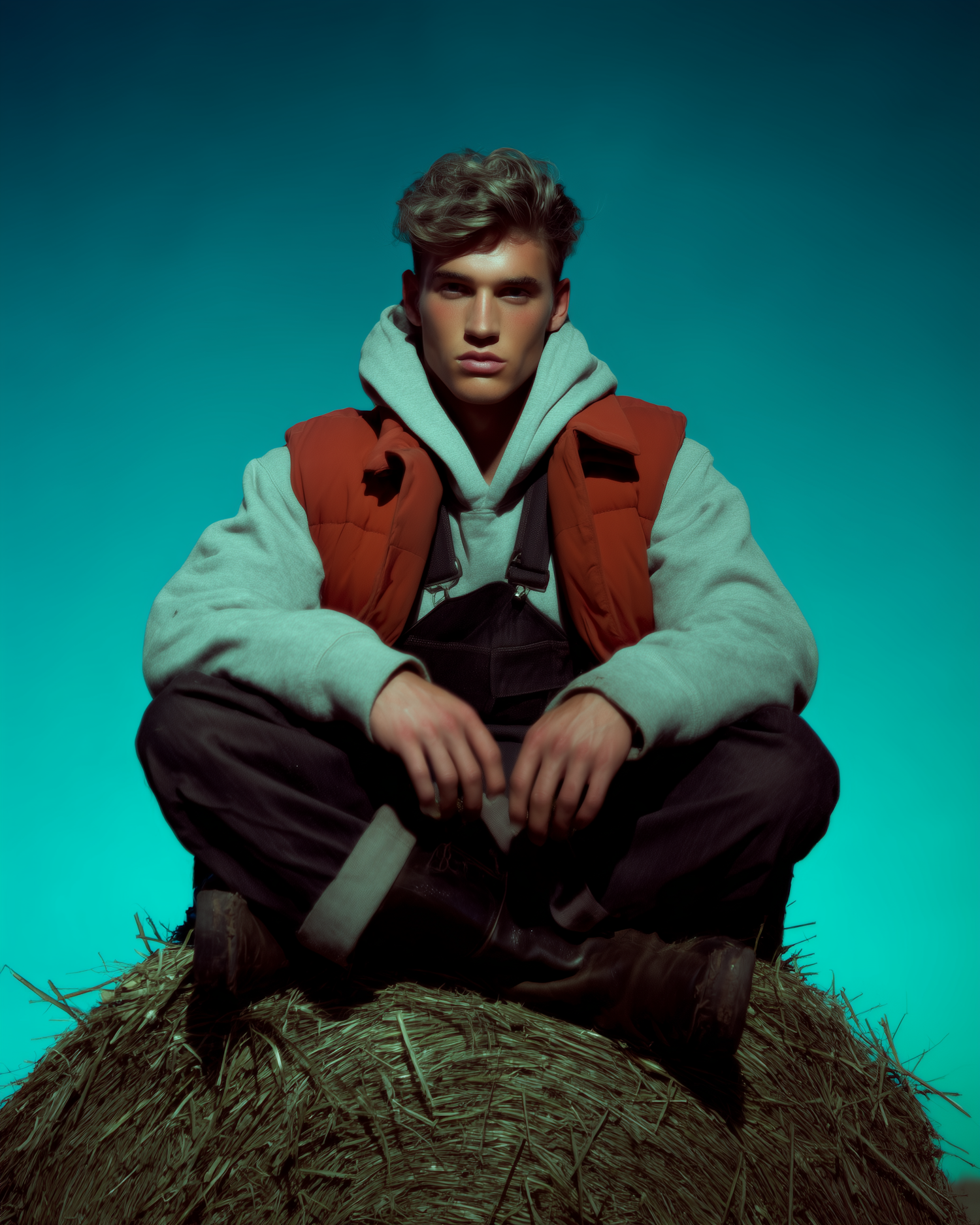 A young man in a hoodie and vest sits on a hay bale against a teal background, exuding a modern rustic vibe.