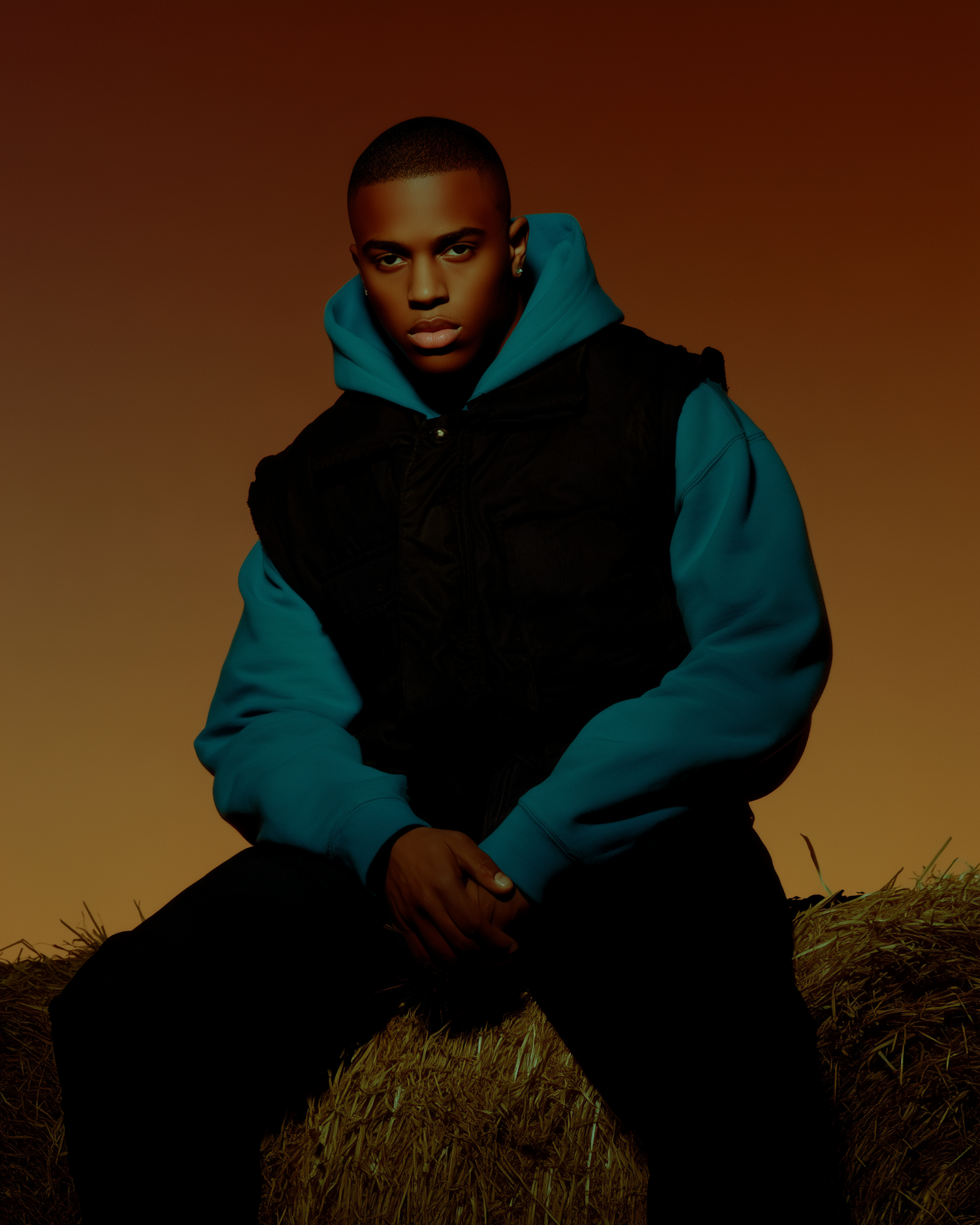 A young man in a teal hoodie and black vest sits on a hay bale against a warm orange background, creating a striking portrait.