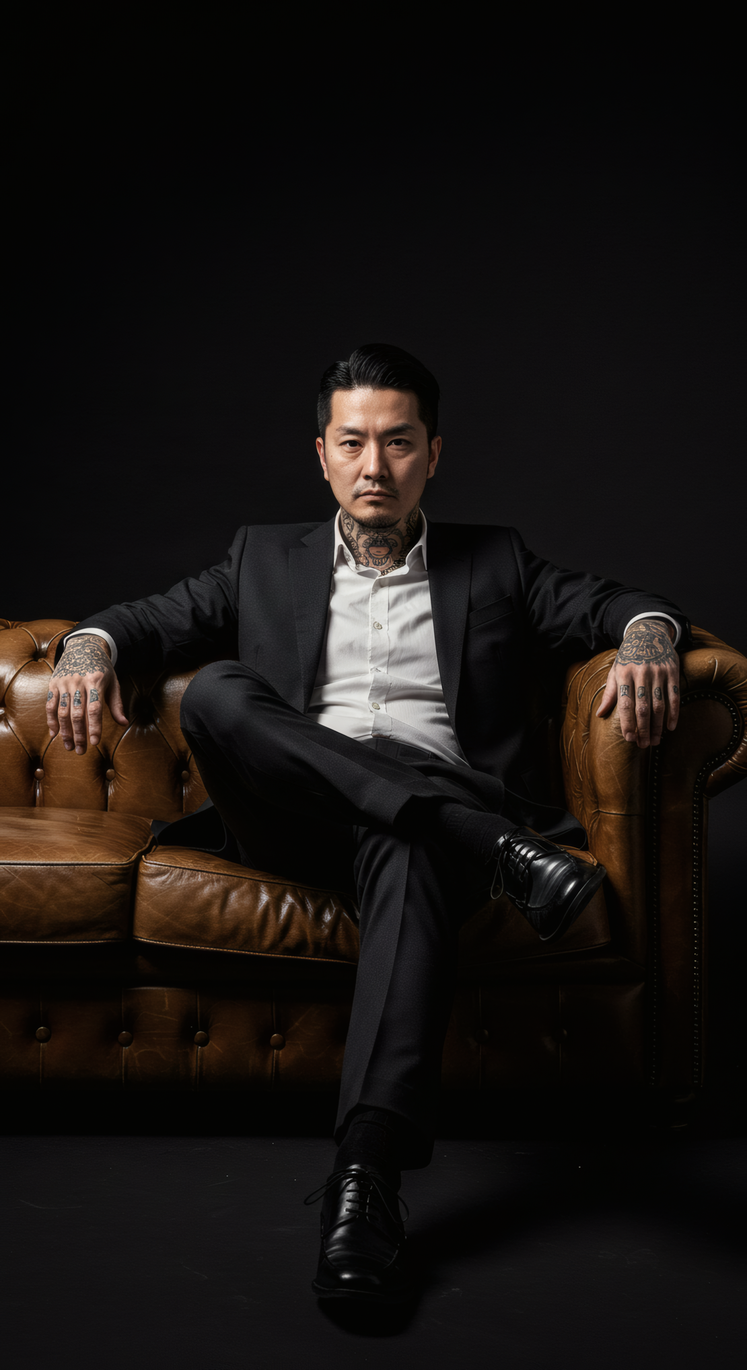 Asian man in a black suit with tattoos sits confidently on a leather couch against a dark background.