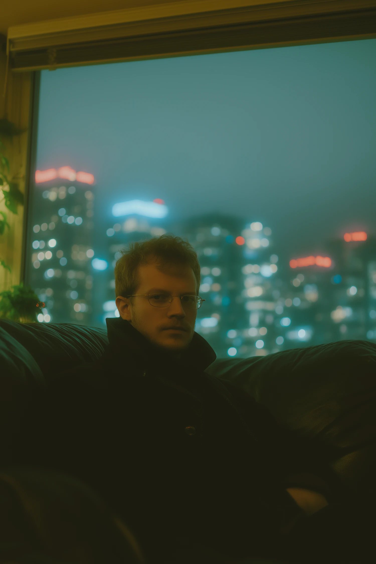 A man sits on a couch in a dimly lit room with a cityscape glowing through the window behind him.