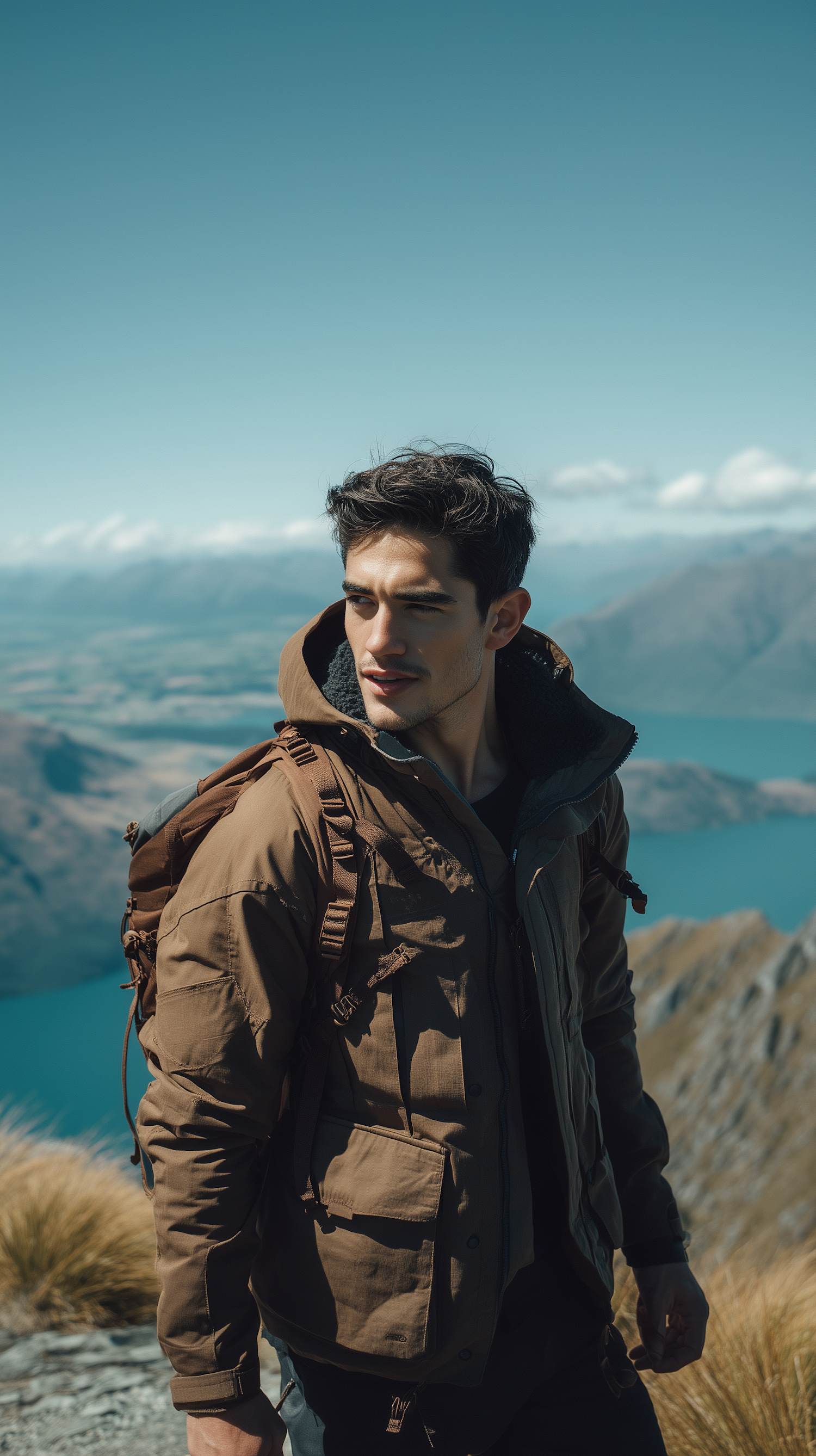 Man in a brown jacket and backpack on a mountain trail, with a scenic lake and hills in the background under a clear blue sky.
